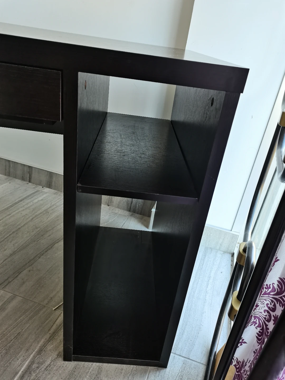 This is a used desk with a single drawer and shelving on one side, perfect for a student or home office. The dimensions are 47.5"x23.5"x30h. It's a sturdy desk and I'm looking to give it a new home.