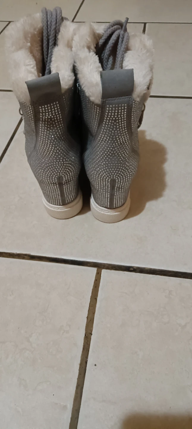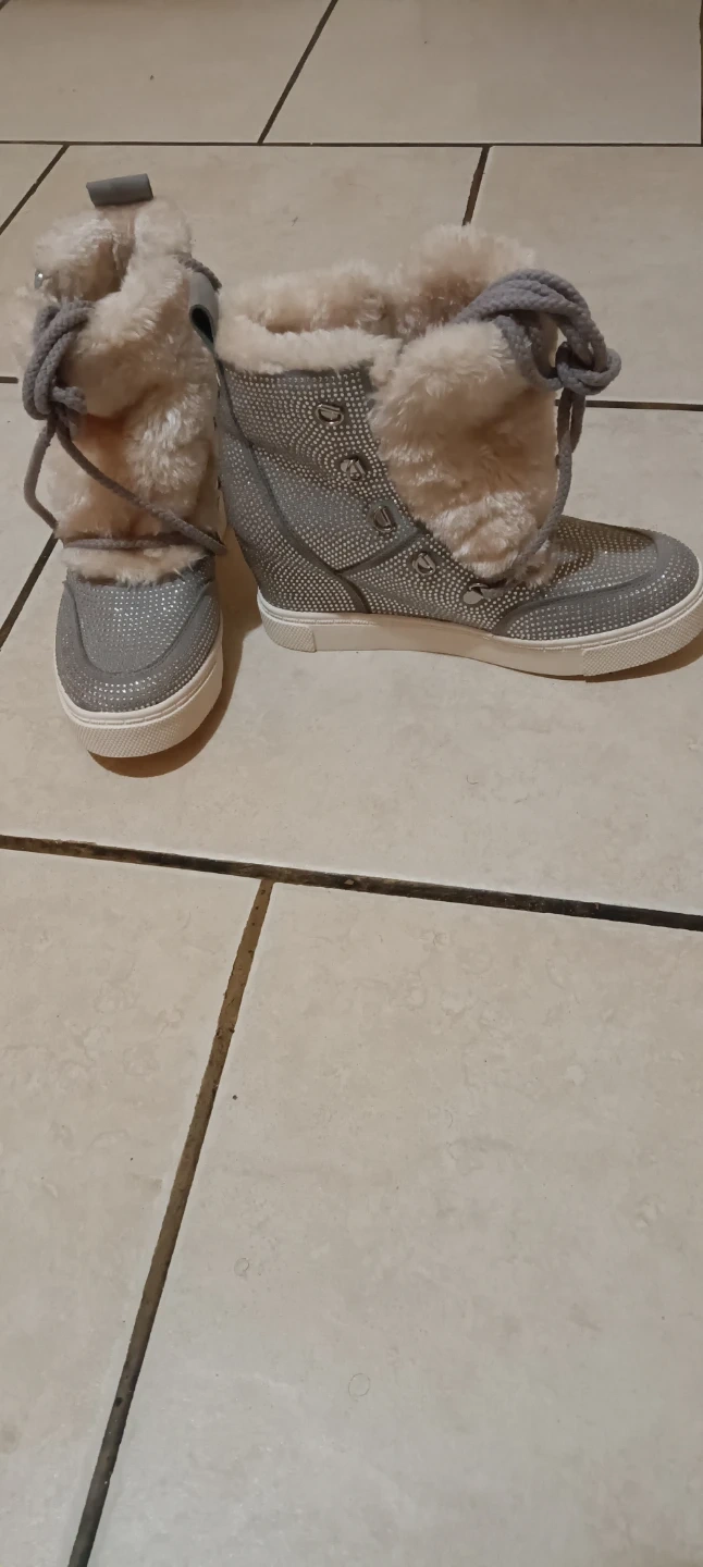 Cute silver wedge heel boots with faux fur lining! They have a lace-up design and are in great condition. Perfect for adding a little sparkle to your winter wardrobe!