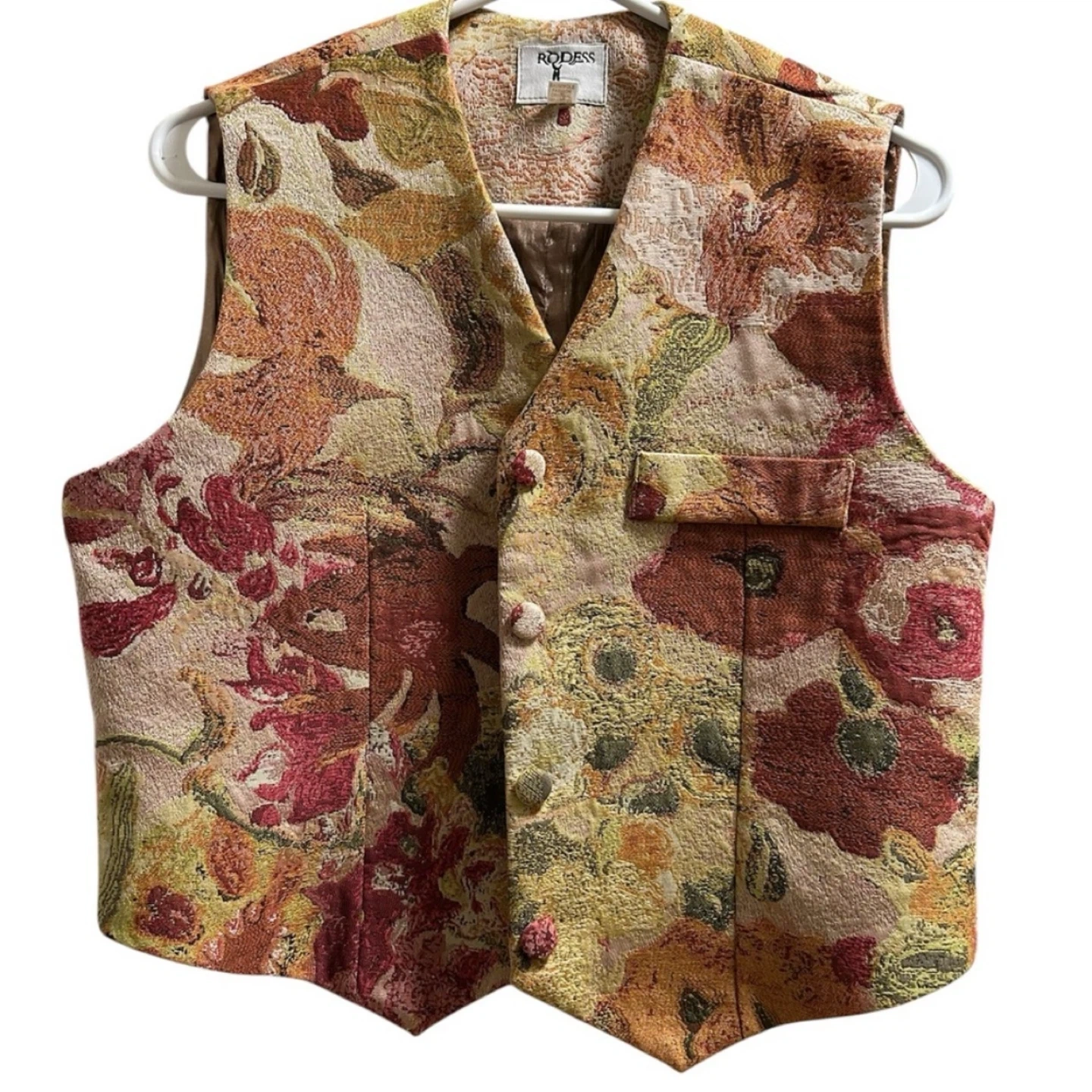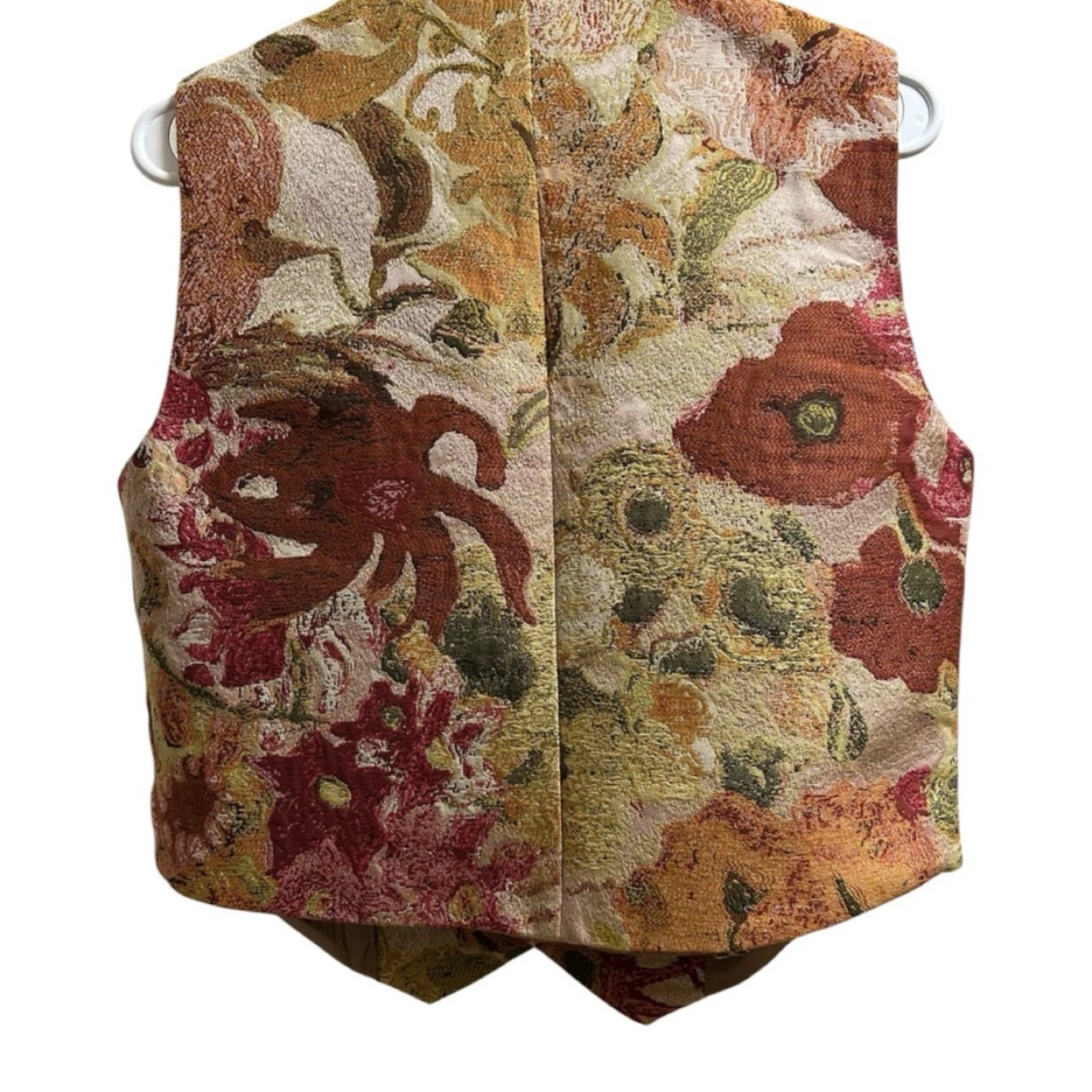 This vest features a beautiful floral tapestry design! perfect for adding a unique touch to any outfit.