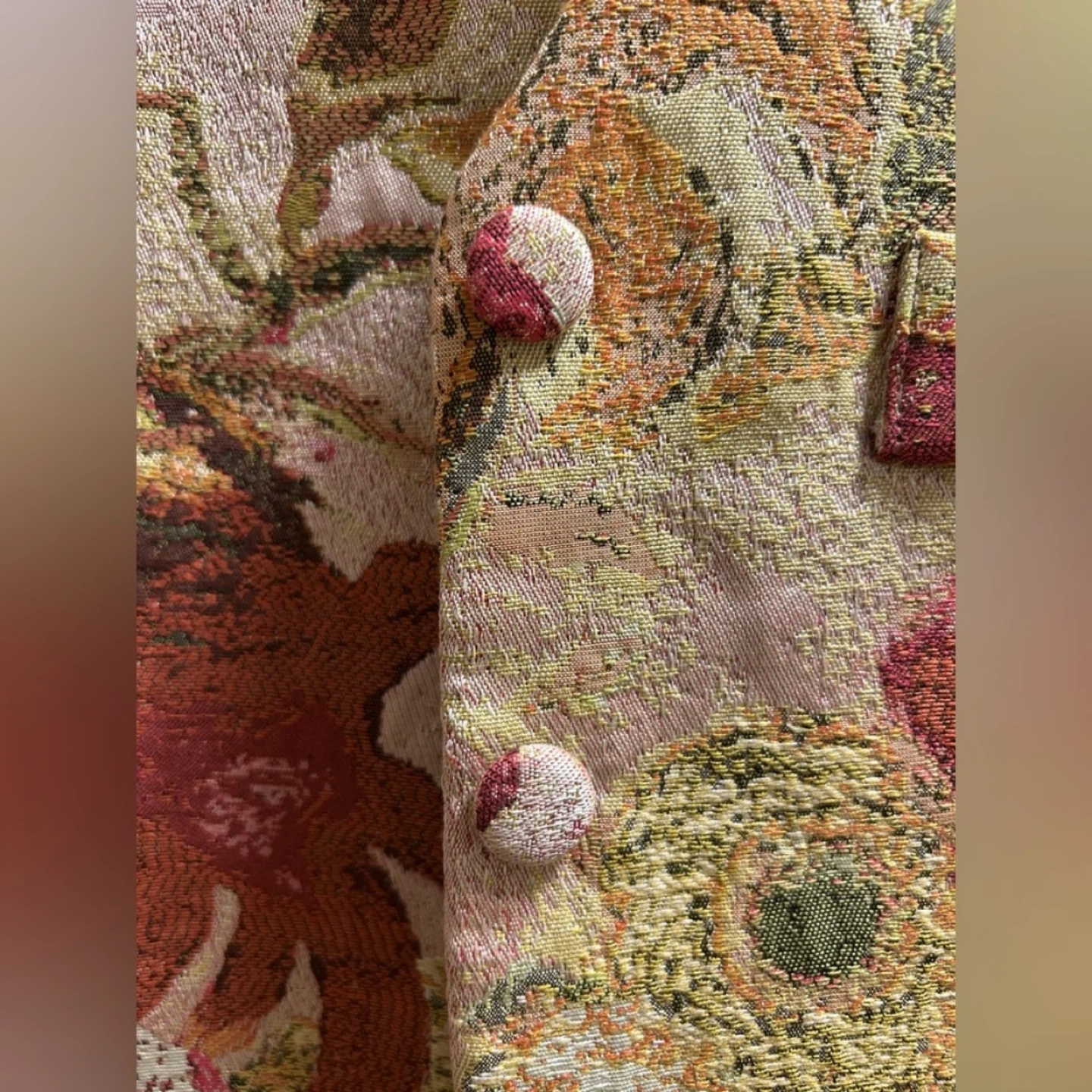 This vest features a beautiful floral tapestry design! perfect for adding a unique touch to any outfit.