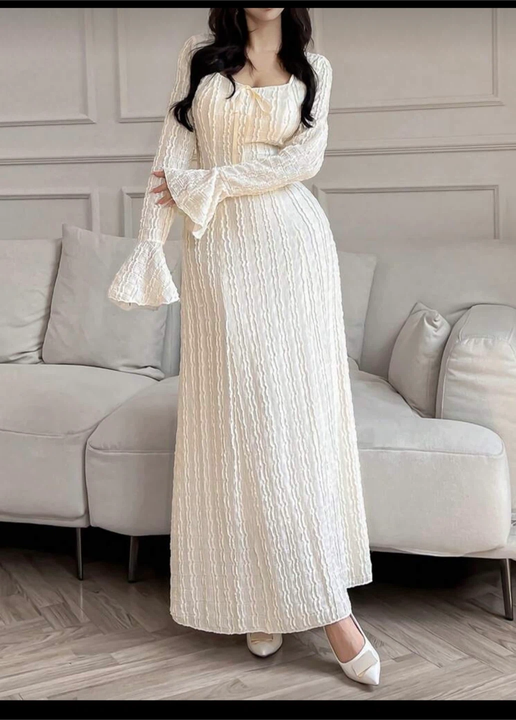 Selling a lovely cream-coloured maxi dress with long sleeves! The dress features a textured pattern and a flattering silhouette. Perfect for a special occasion or a stylish everyday look