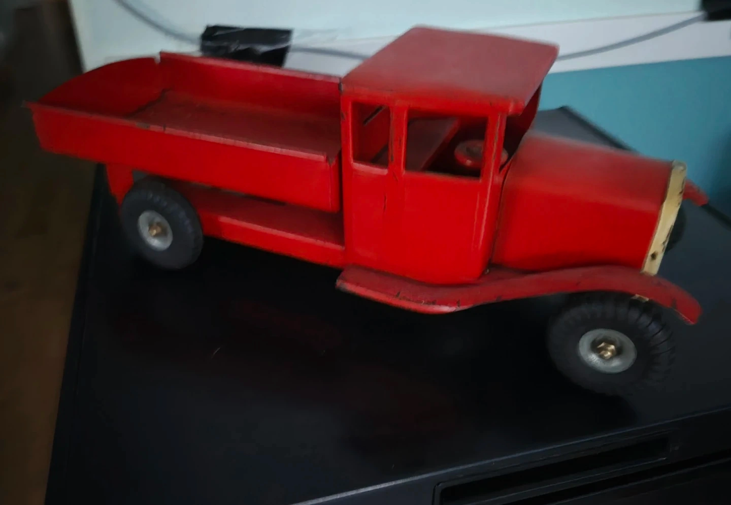 Selling a vintage red metal toy truck! It has a classic design and would be a great addition to any collection or a fun toy for kids. Shows some signs of wear, adding to its vintage charm 🥕