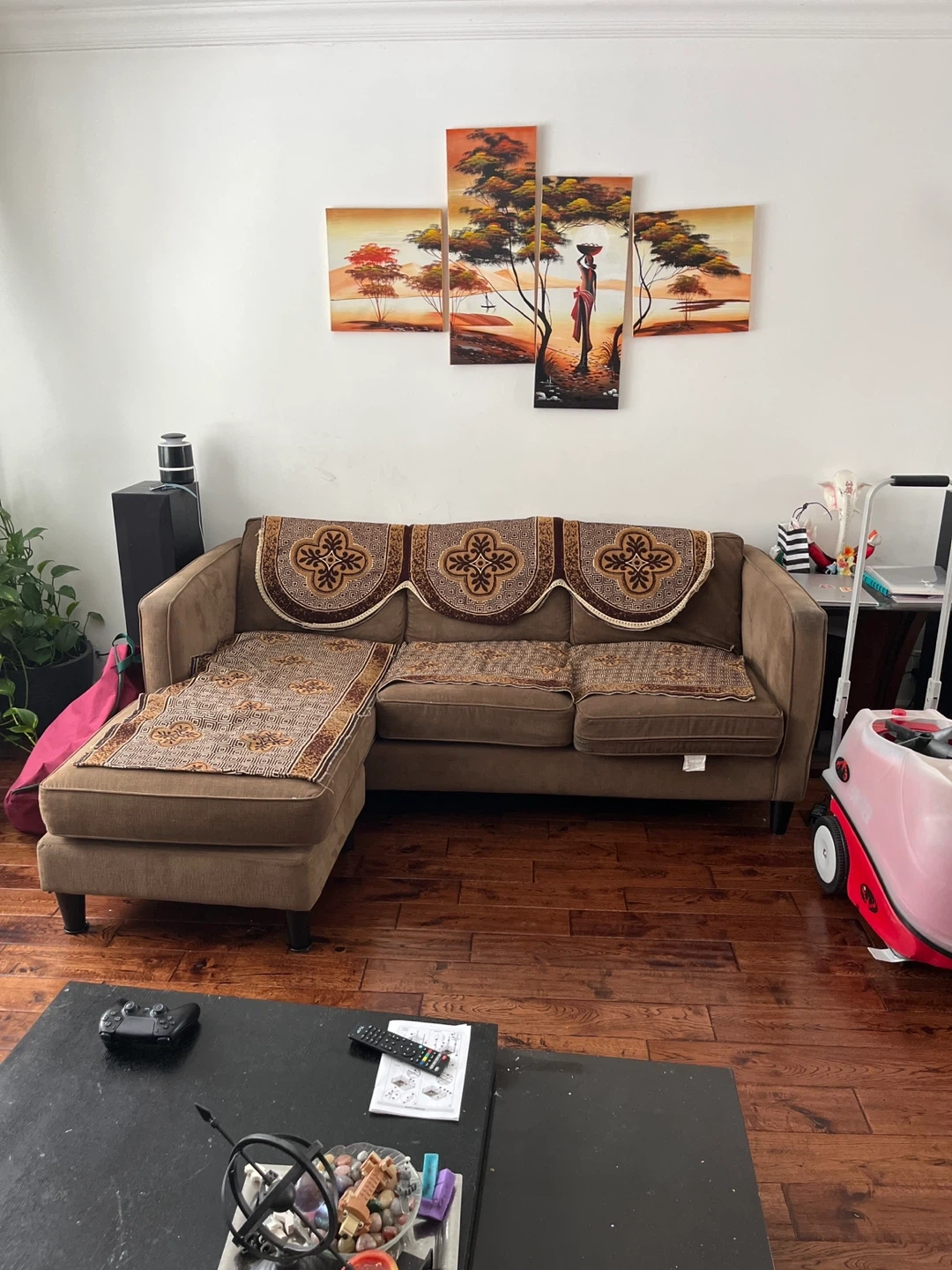 Selling a comfortable brown sectional sofa with an ottoman. It's in good condition and would be a great addition to any living room!