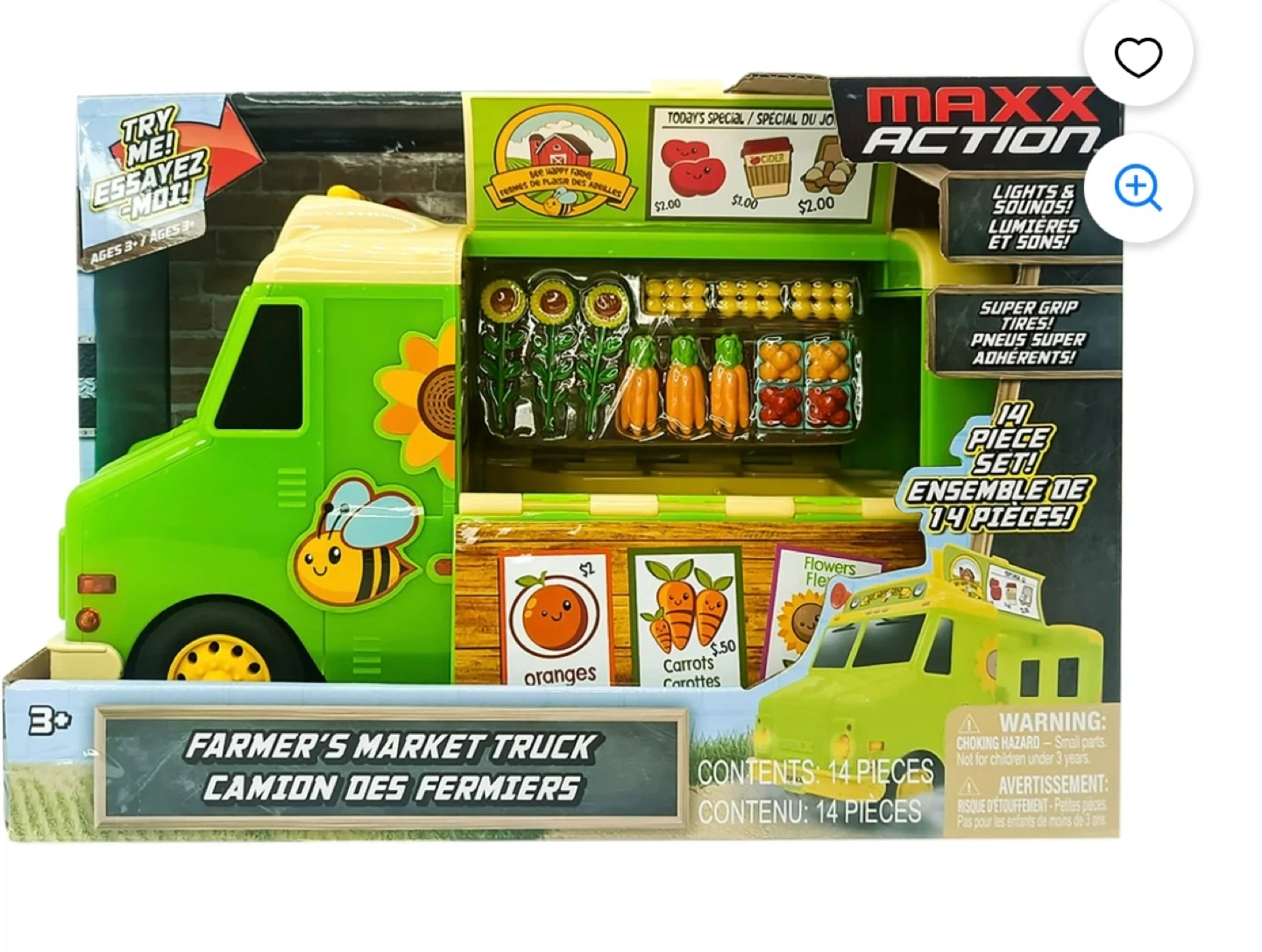 Selling a Maxx Action Farmer's Market Truck playset! It's a 14-piece set with lights and sounds. The truck has super grip tires and includes oranges, carrots, and flowers to sell at the market. Perfect for kids ages 3 and up!