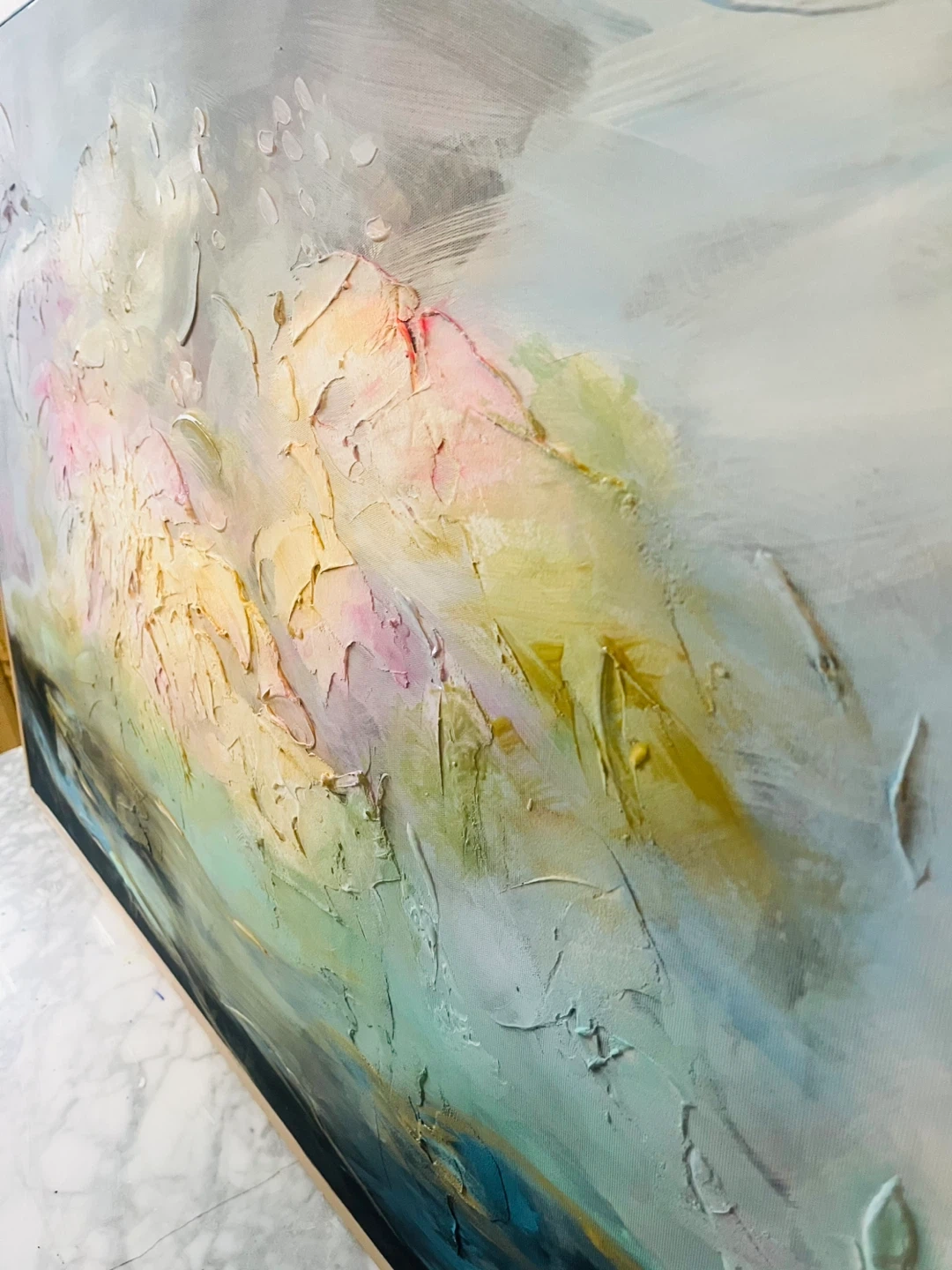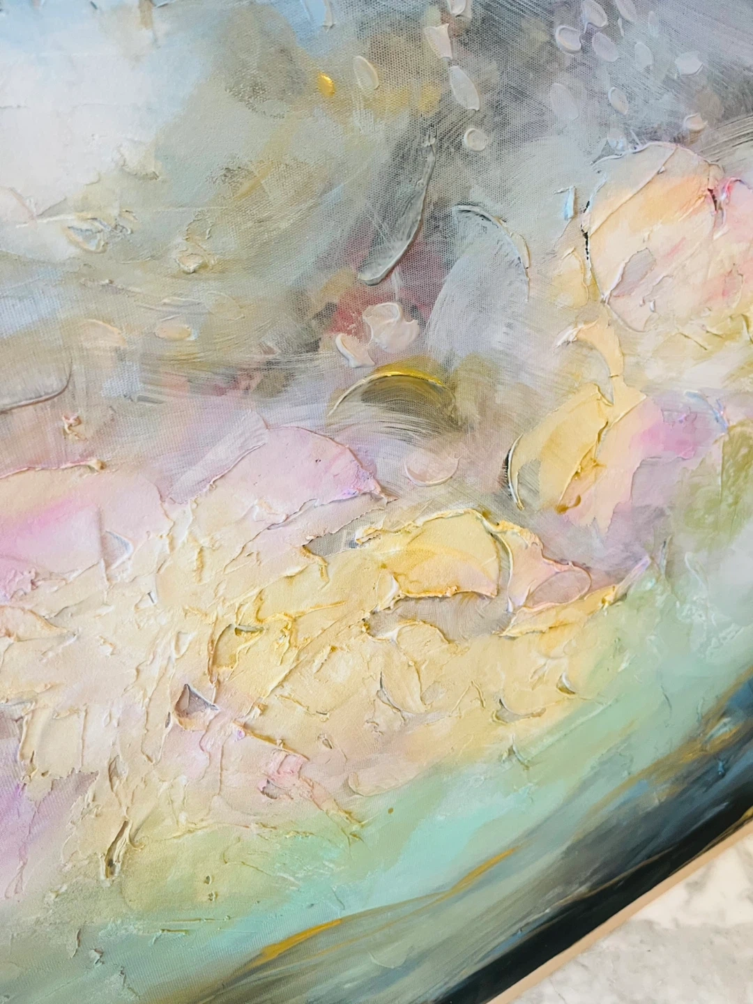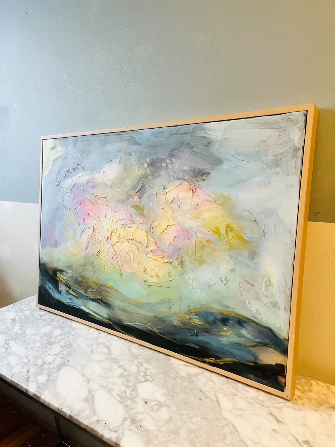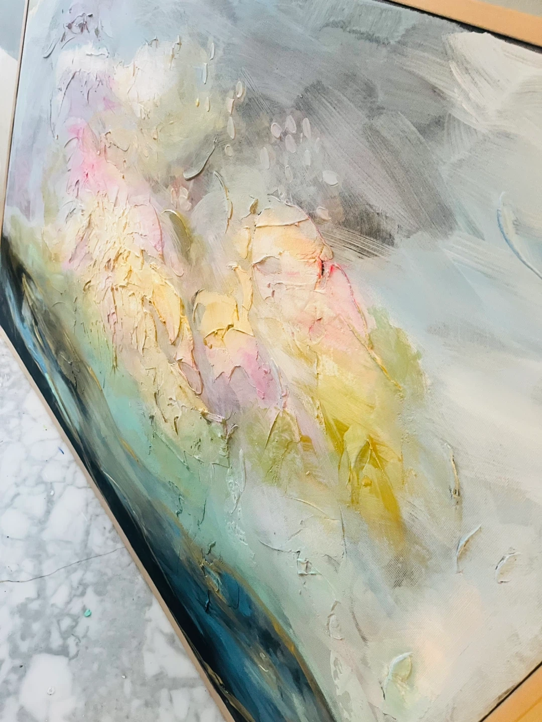 This is an abstract painting with a light beechwood tone frame. It has a mix of colours including blues, pinks, yellows and greys. It would look great in any room!