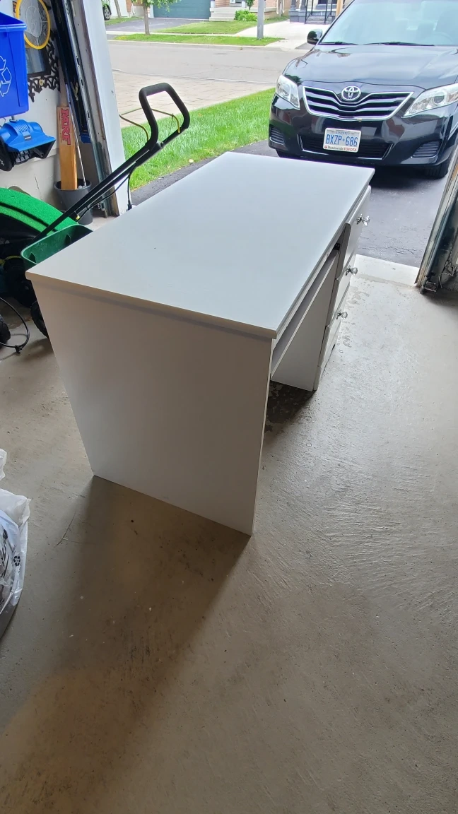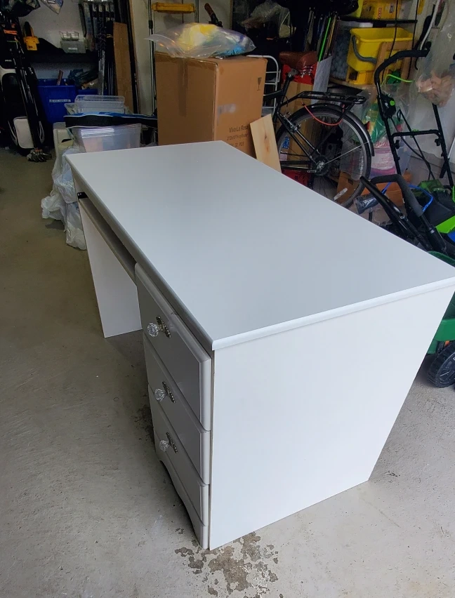 Selling a white vanity desk that’s in great shape! It features a smooth, clean surface and three drawers with decorative knobs. Perfect for a bedroom or home office setup