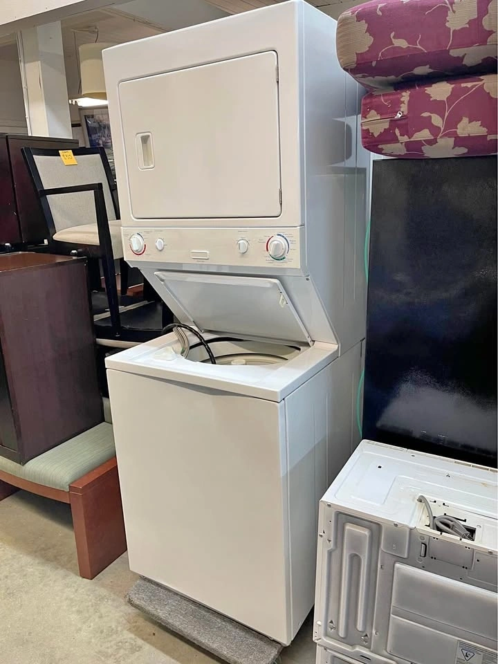 We have a one of these upright washer dryer sets available. They’re from a hotel change out. The one I have is a little more dented than the photos. That’s why the price is so low at $200!