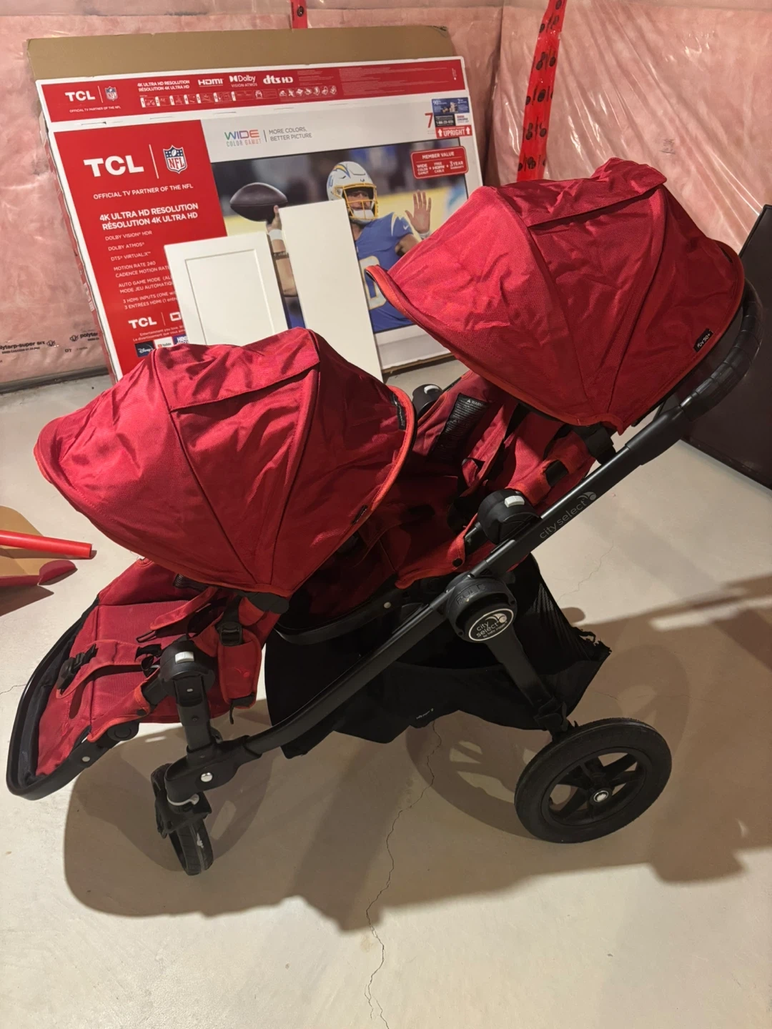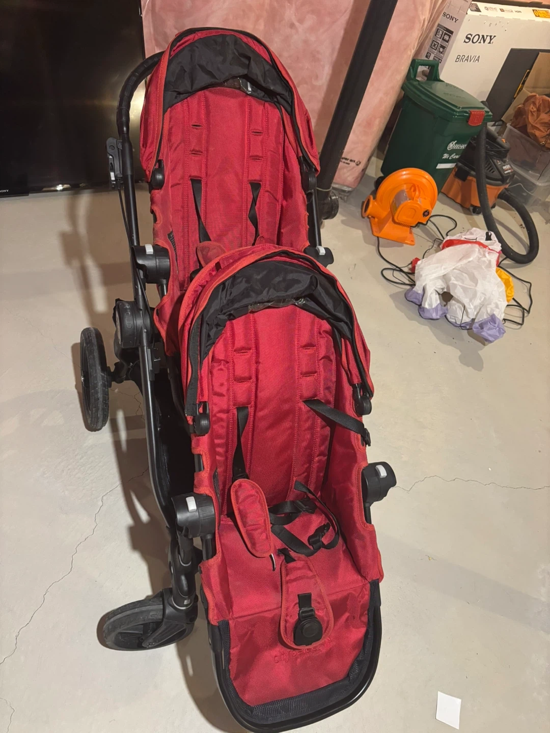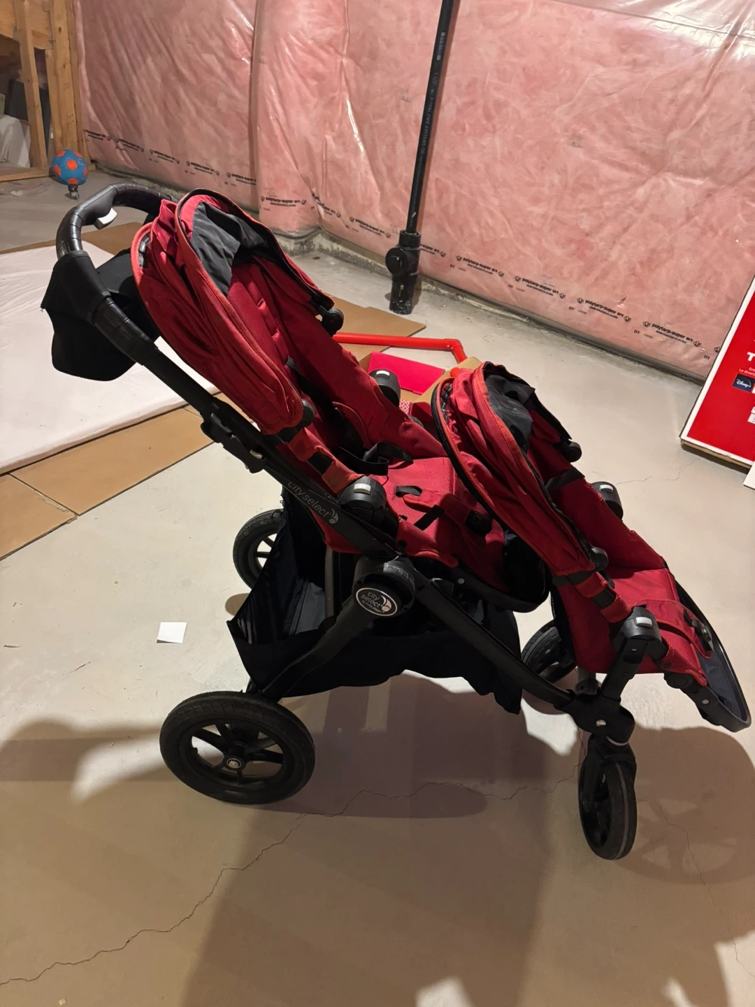 Selling a Baby Jogger City Select double stroller in red. The stroller has some wear and tear, particularly on the bottom basket, but it's still functional for getting around with two little ones. Please see the photos for details on the condition.