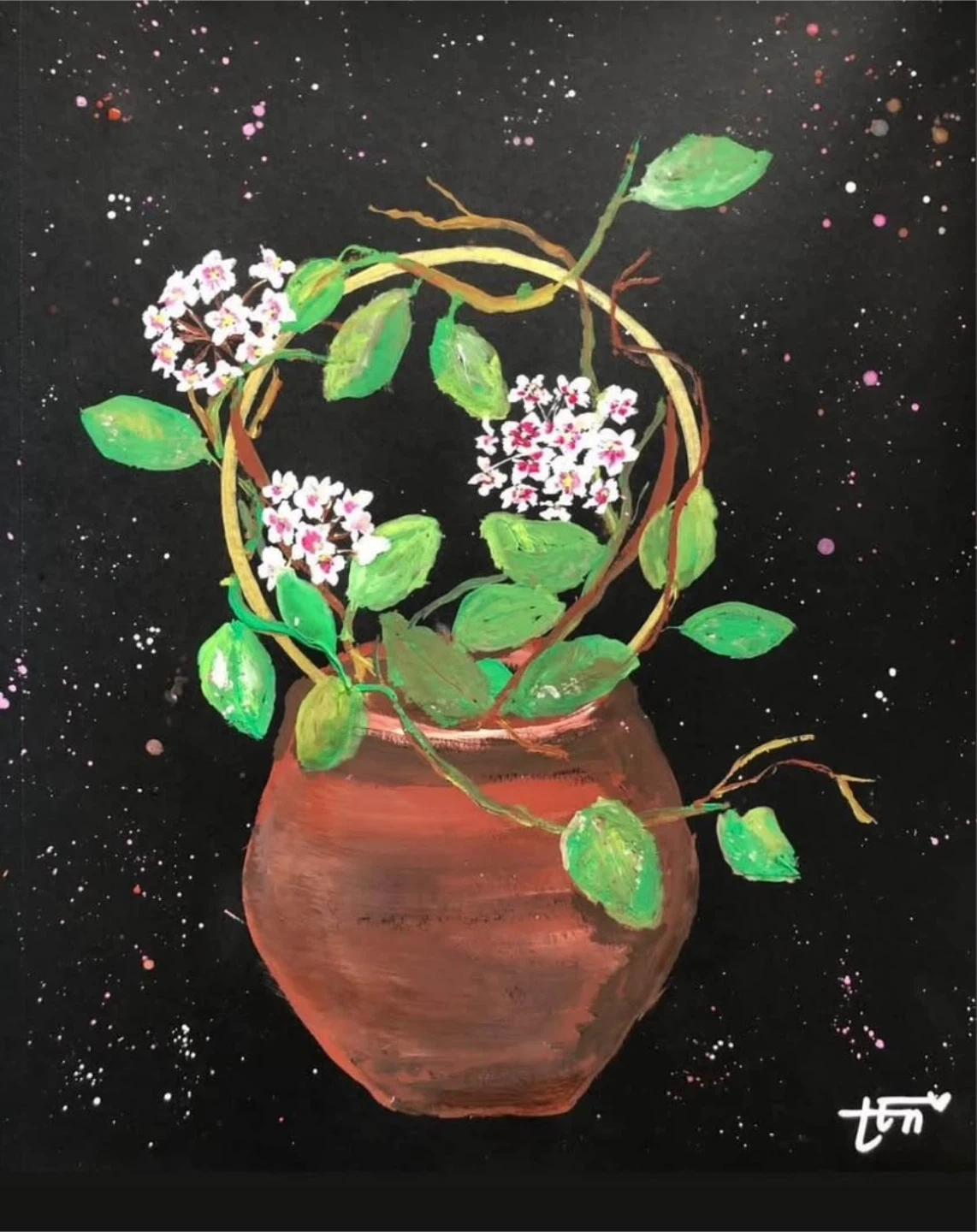 This is not a print: Original painting of flowers in a pot on a black background with white and pink speckles. Artist signature on the bottom right.