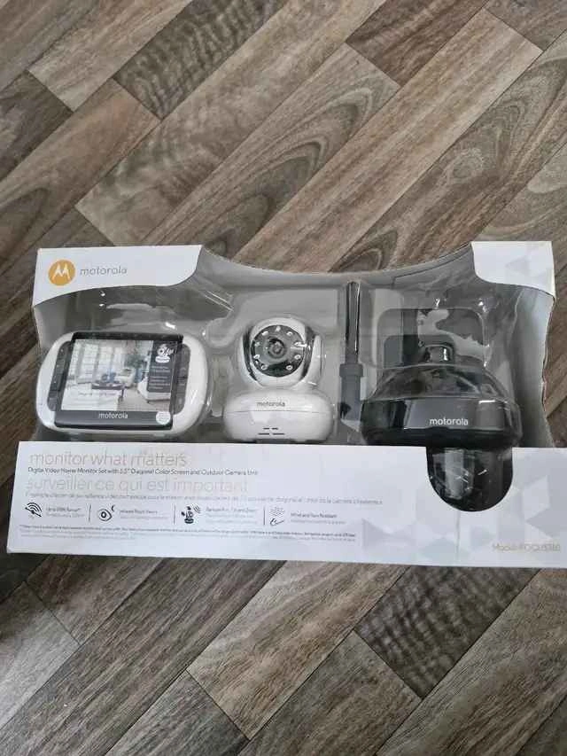 Motorola FOCUS360 video monitor and camera set. Open box but never used. 3.5" screen, indoor pan/tilt camera, outdoor camera. Great for home security or baby monitoring.