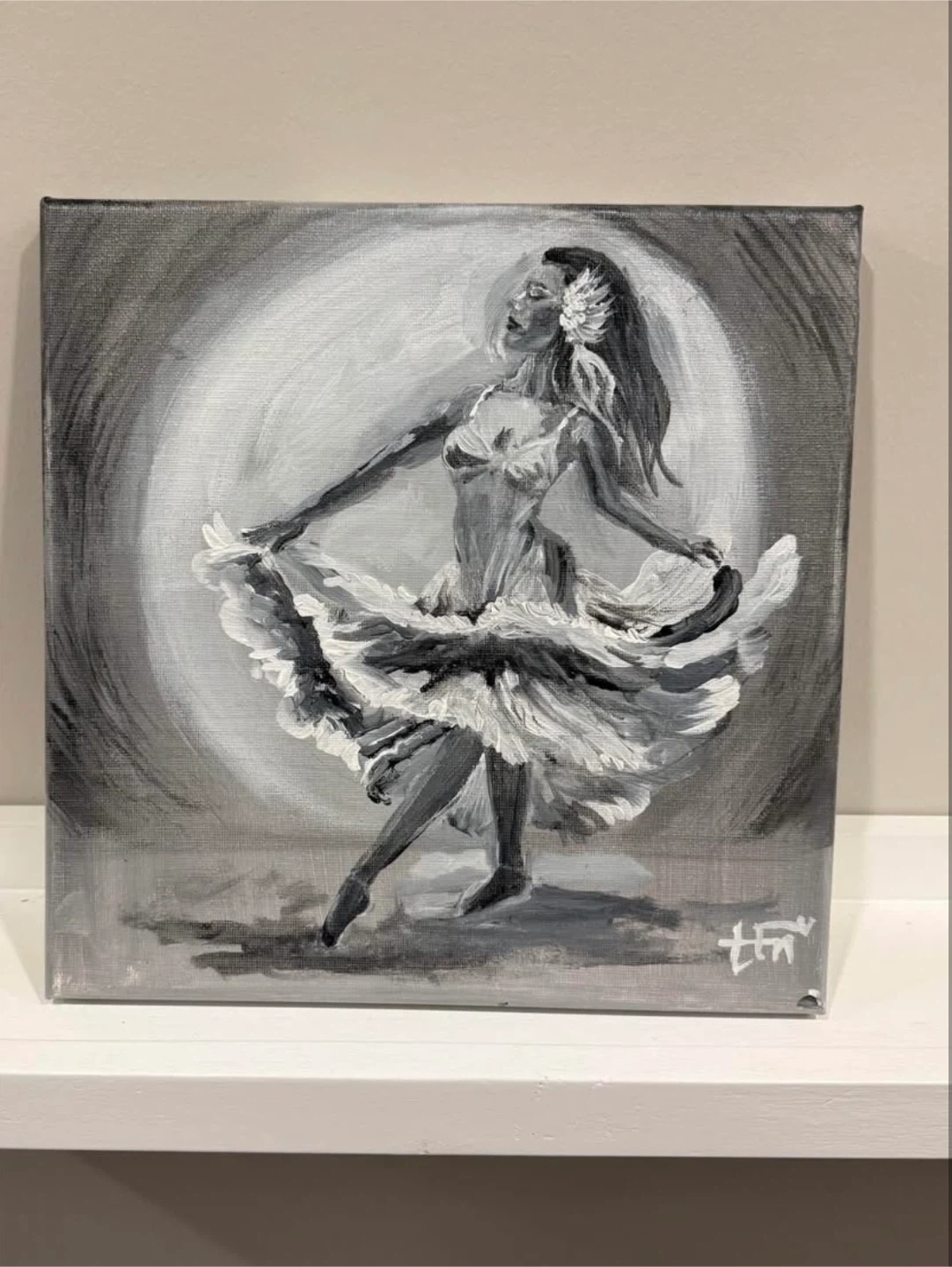 A beautiful black and white painting of a ballerina. The painting is on canvas. Perfect to display on its own as part of the collection. Perfect unique gift for dance aficionados.