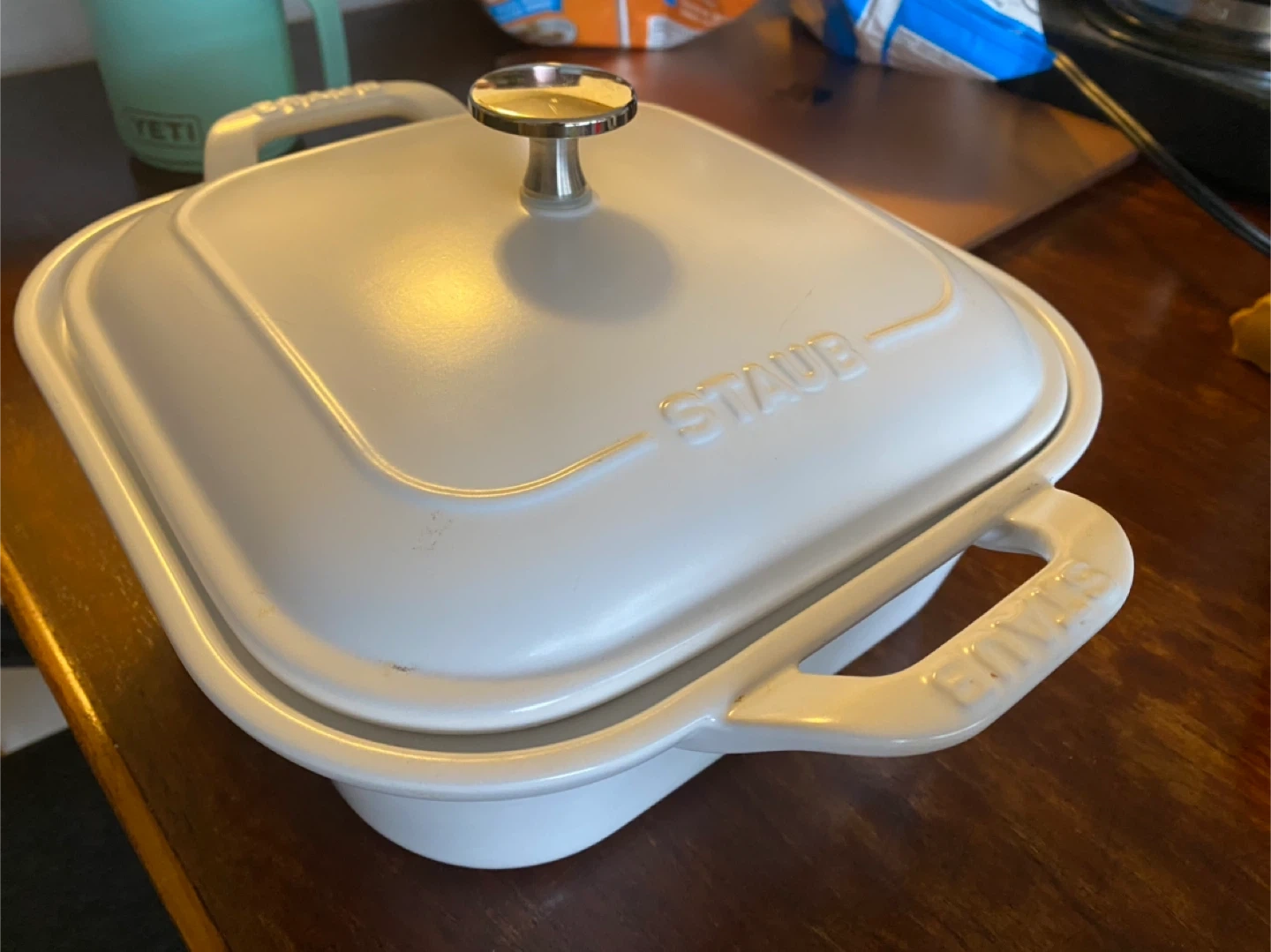 Selling a Staub square Dutch oven in white. There are some visible cracks on the enamel, as shown in the pictures, but it's still a great piece for cooking! Only used once. It's perfect for stews, roasts, and baking