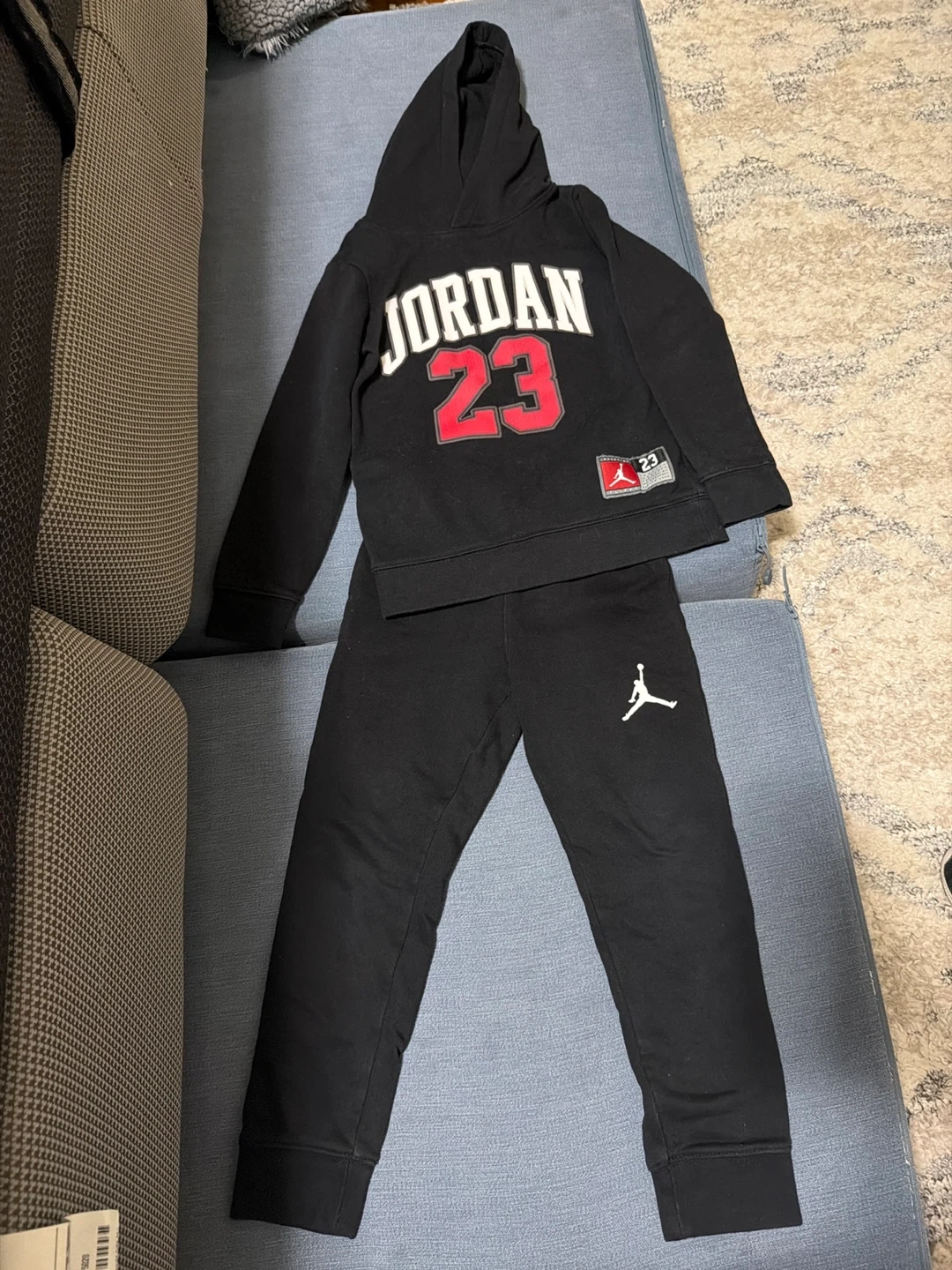 Selling a Jordan hoodie and pants set. The hoodie is black with "JORDAN 23" in white and red on the front. The pants are also black with the Jordan logo on the side. Great for a sporty look!