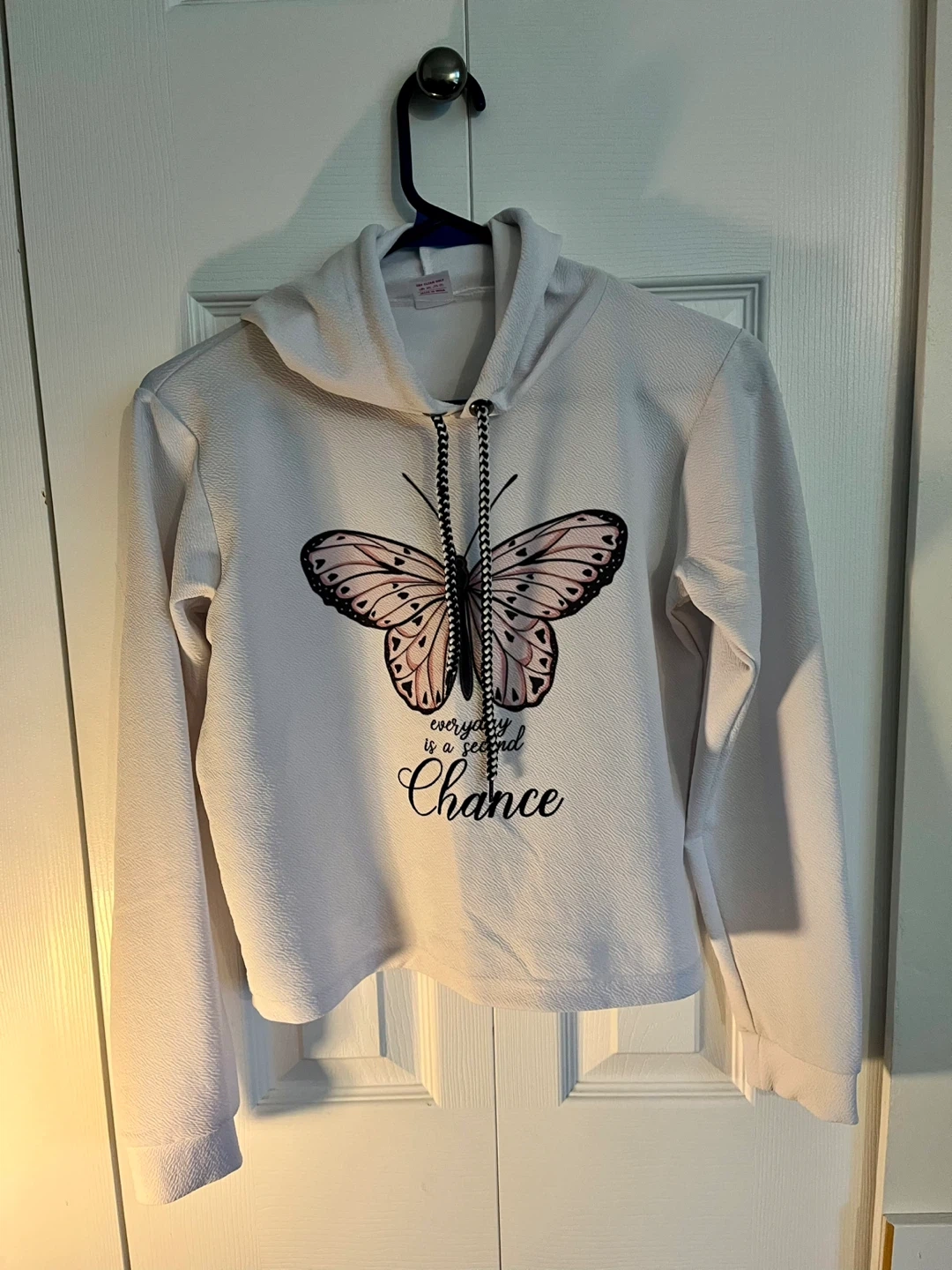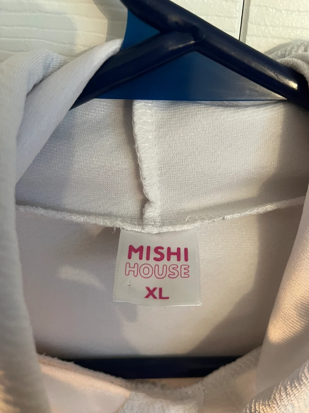 Selling a Mishi House hoodie featuring a butterfly design! It's a size XL and has a cute, casual look. The hoodie is white with black and white drawstring.