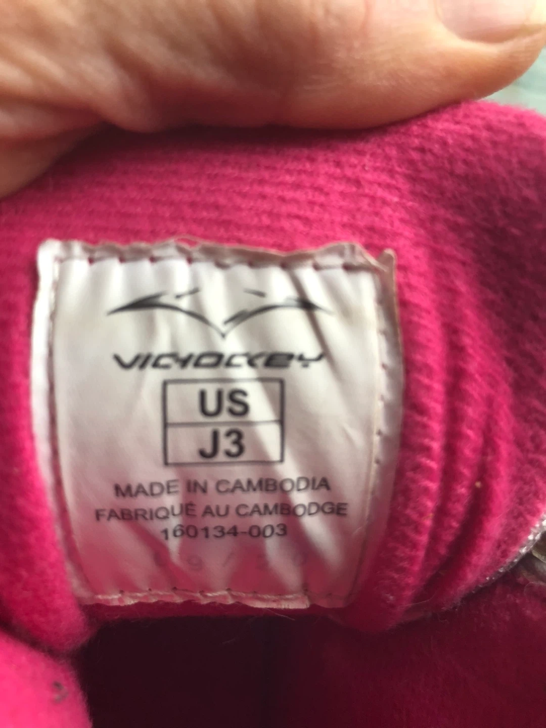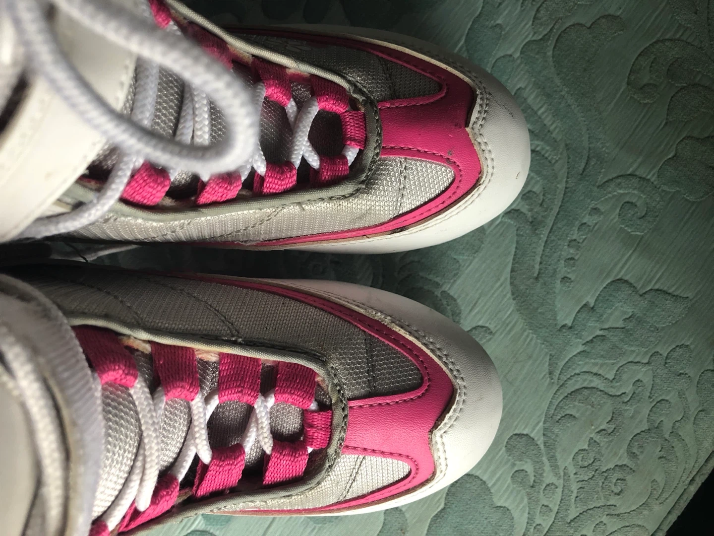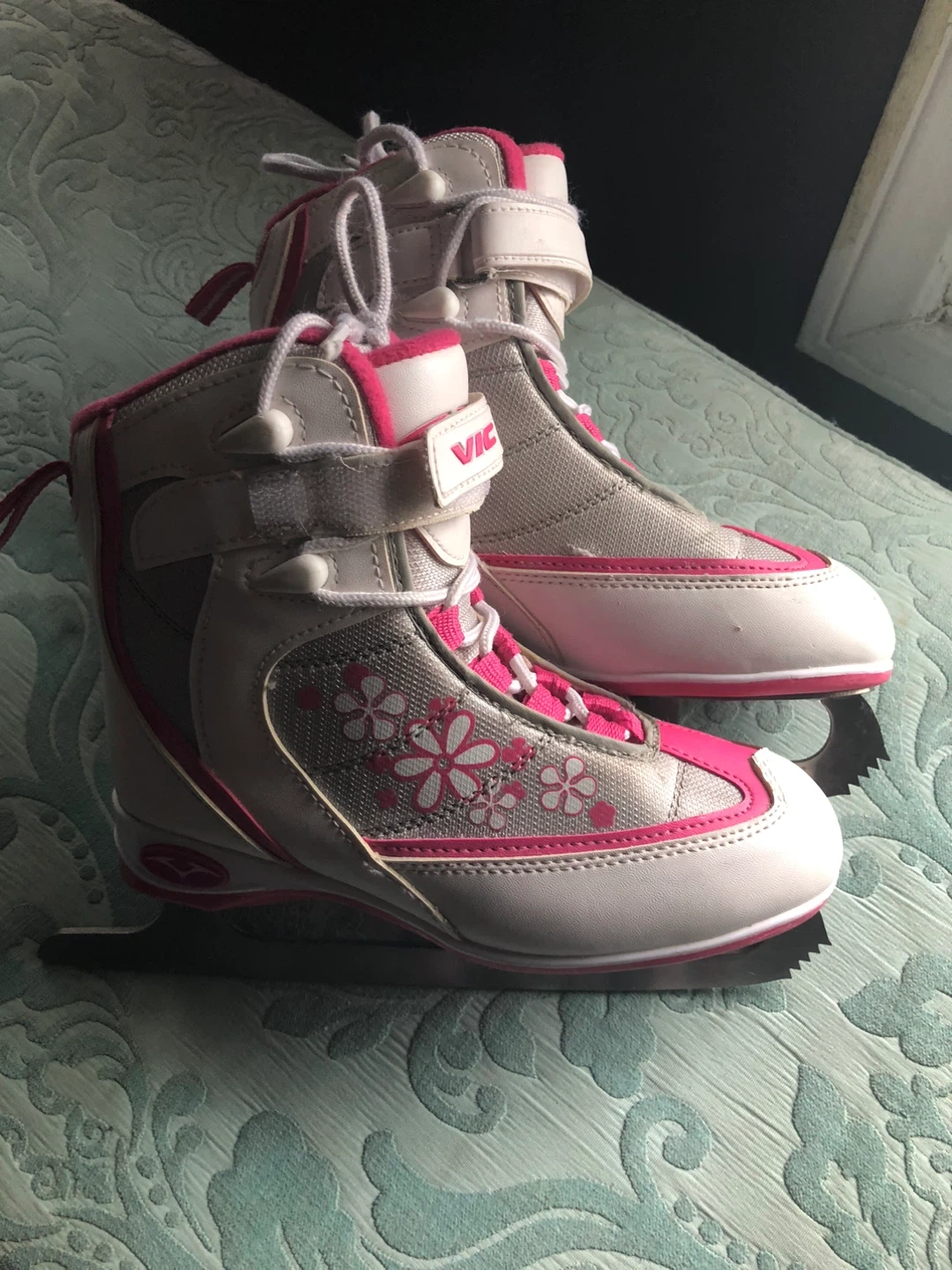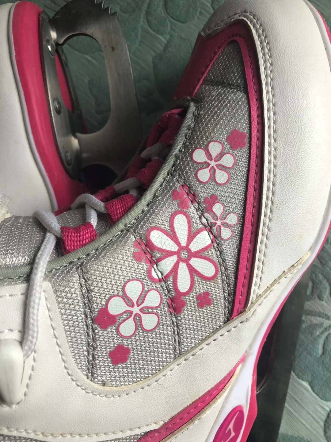 Ice skates in US size J3! They are in good condition and ready for some fun on the ice. The skates have a cute pink and white design with floral details.
