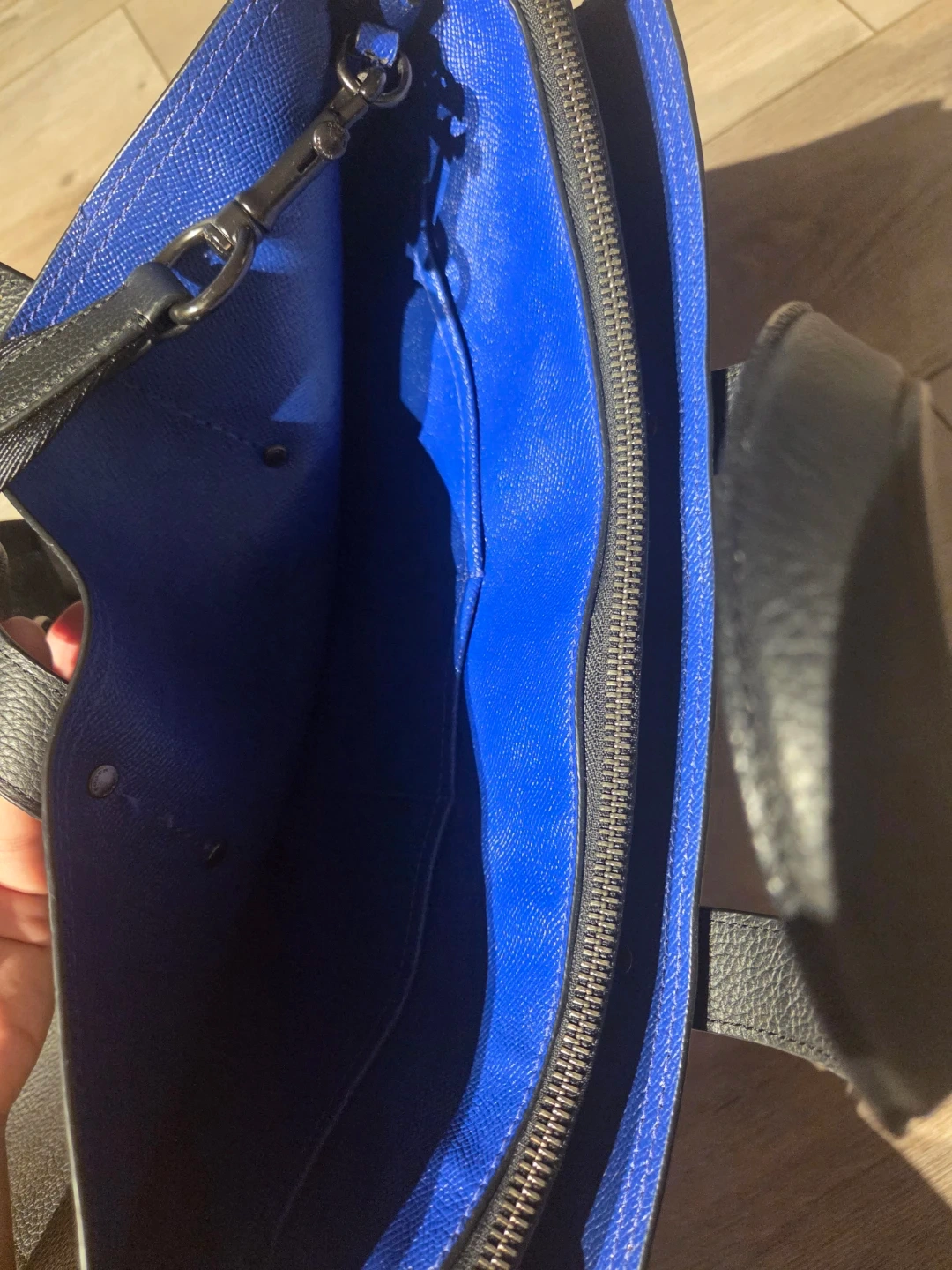 Looking to sell this Coach tote bag. It's a stylish and practical bag in black leather, perfect for everyday use. The interior is a vibrant blue. It's in great condition!