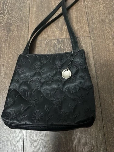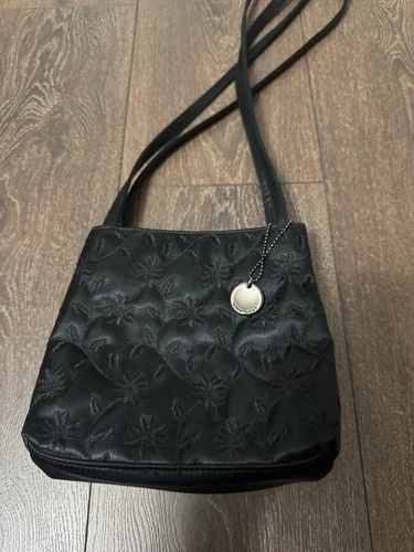 NINE WEST black satin handbag, a piece that combines elegance with a touch of whimsy. The flower stitching detail adds a feminine and unique touch to the classic black exterior, making it a standout addition to any outfit.