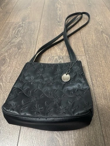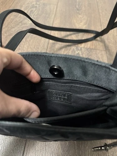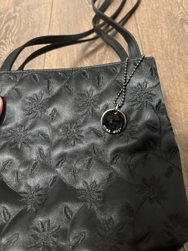 NINE WEST black satin handbag, a piece that combines elegance with a touch of whimsy. The flower stitching detail adds a feminine and unique touch to the classic black exterior, making it a standout addition to any outfit.