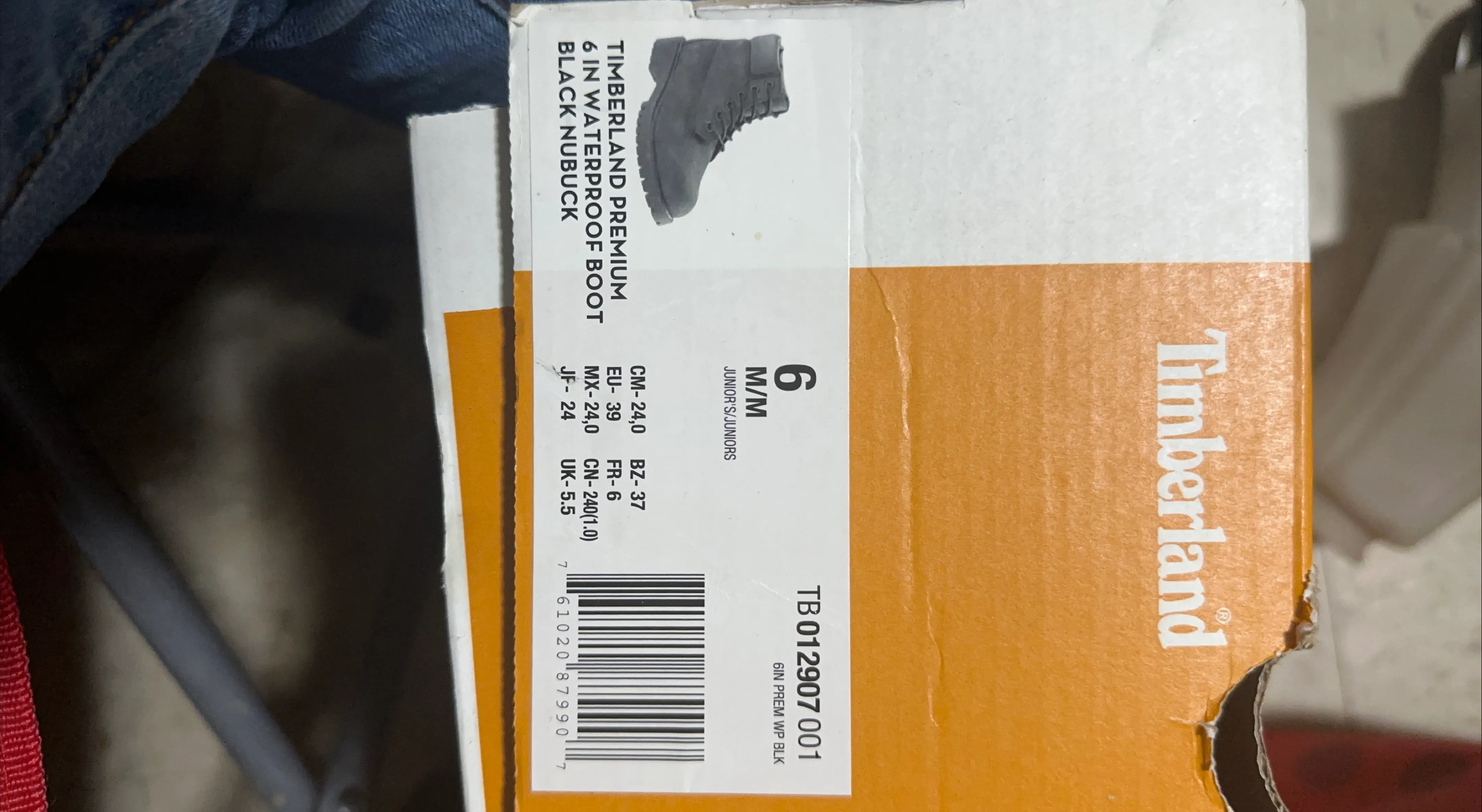 Selling a pair of Timberland Premium 6-inch Waterproof Boots in black. They are a Junior's size 6 and come with the original box. These boots are perfect for keeping your feet dry and comfortable in any weather!
