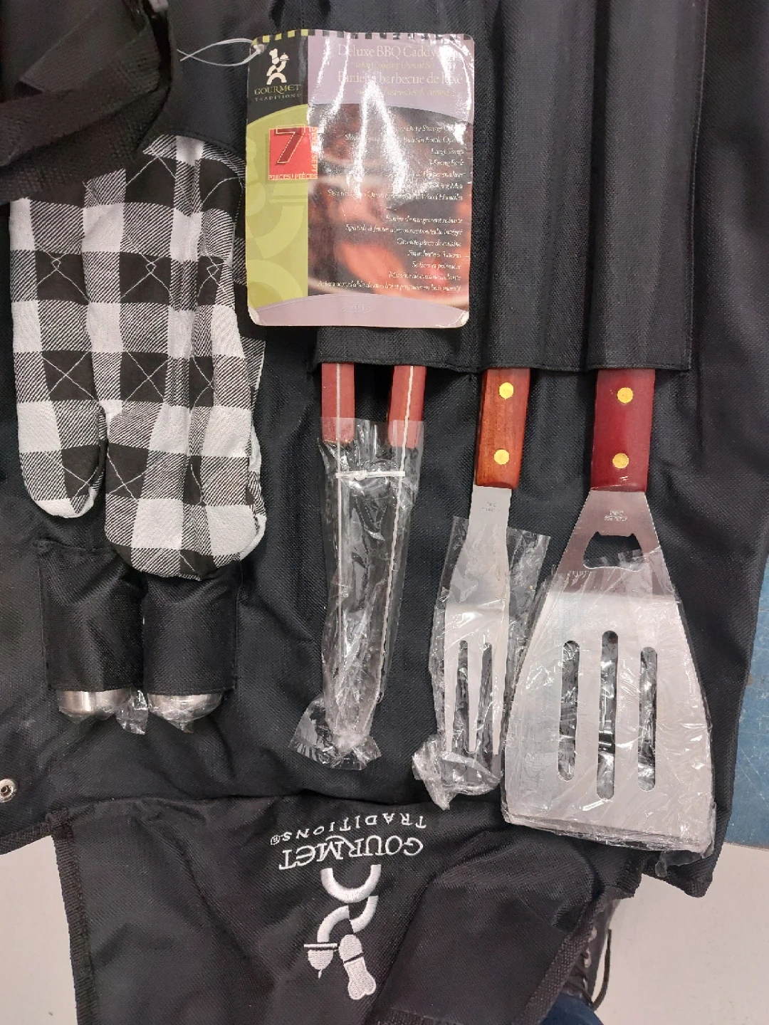 I'm selling a brand new Gourmet Traditions Deluxe BBQ Caddy Set! It includes all the essentials for your next barbecue. The set features a convenient caddy to keep everything organized and within reach. Perfect for grilling enthusiasts!