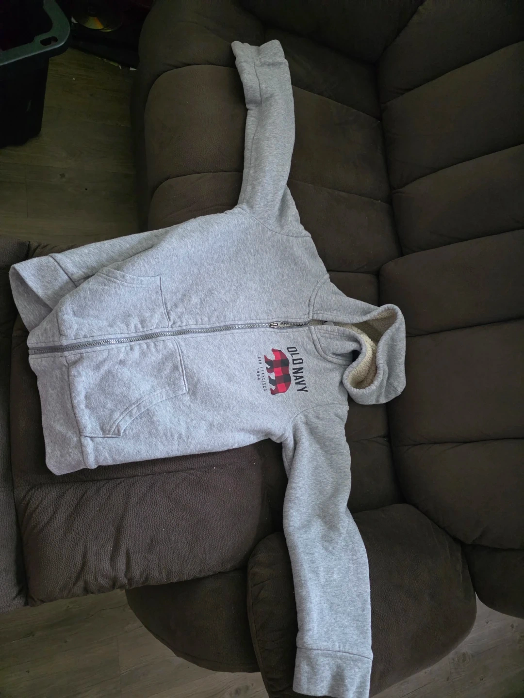 Cozy Old Navy hoodie in size XL (14-16). It's a soft grey colour with a cute bear design. Perfect for keeping warm on chilly days! 20 OBO . First come first serve