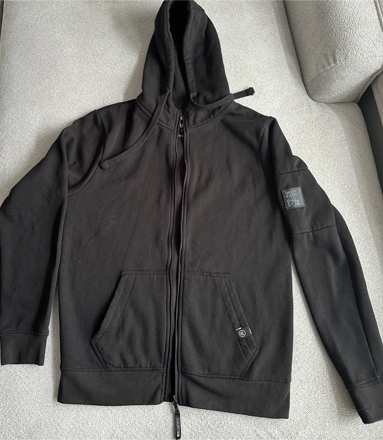 I'm selling a Duck and Cover full zip hoodie in black. It's in great condition and made of quality materials. It is a size medium.