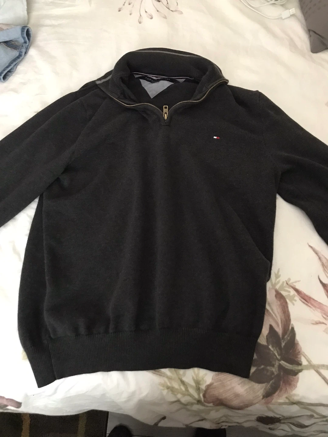 Cozy Tommy Hilfiger quarter-zip sweater in size medium! It's a great layering piece for cooler weather. The sweater is in good condition and ready for a new home worn 3 times pick up downtown Toronto cash only thanks