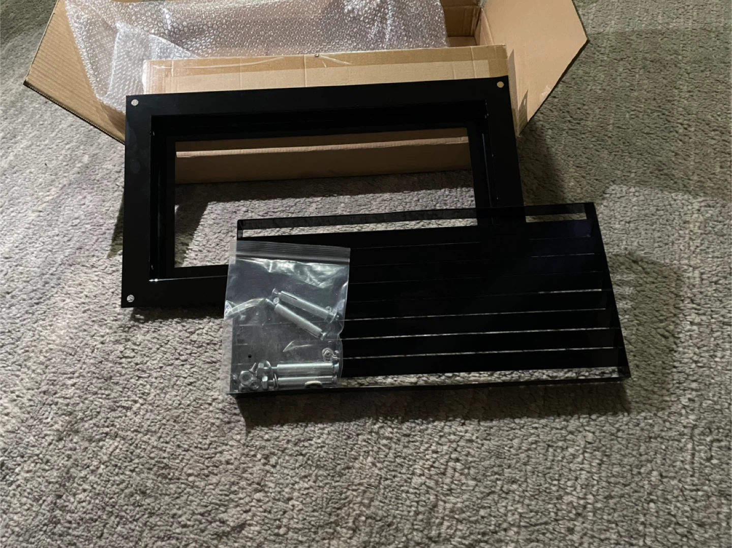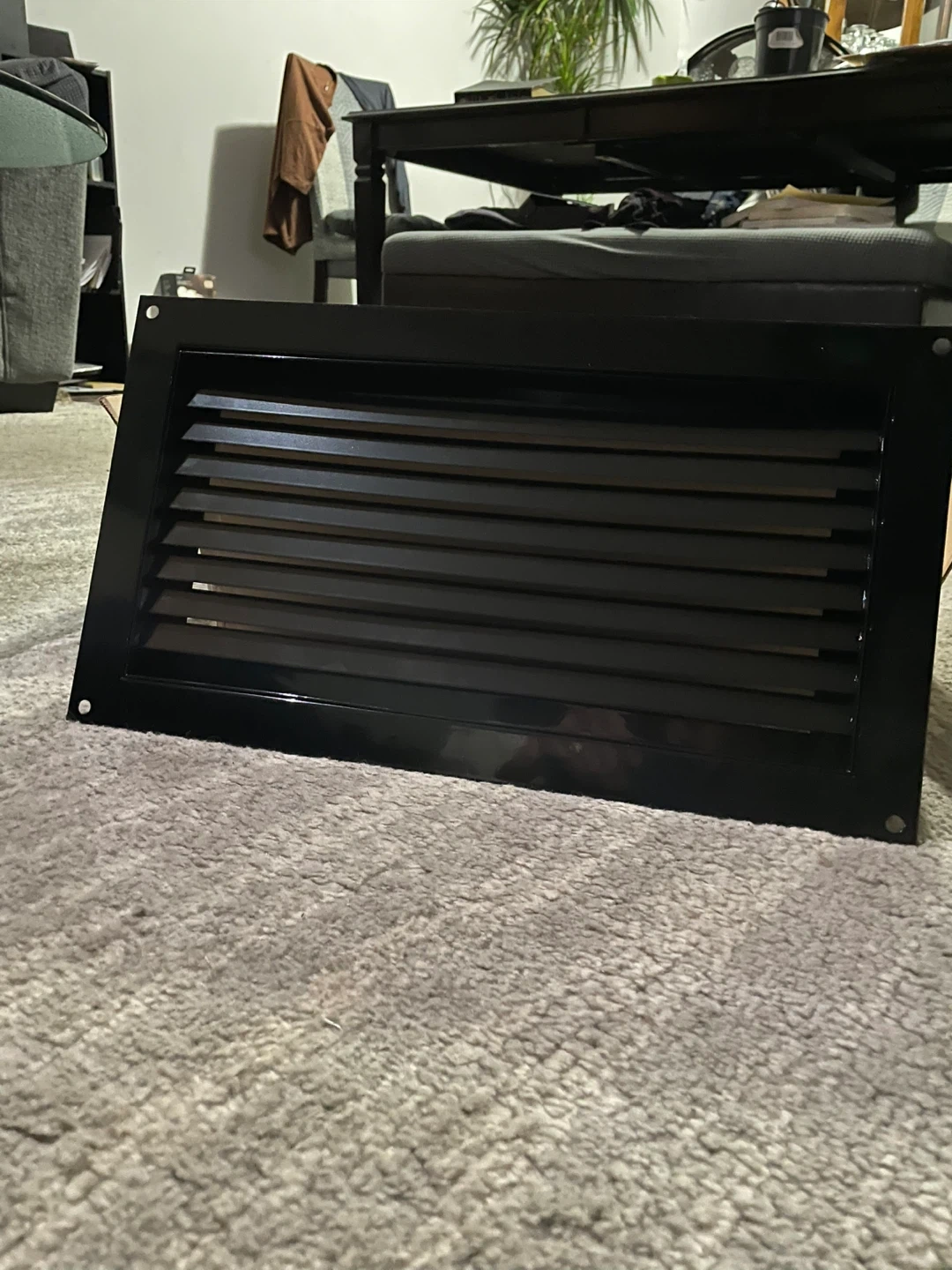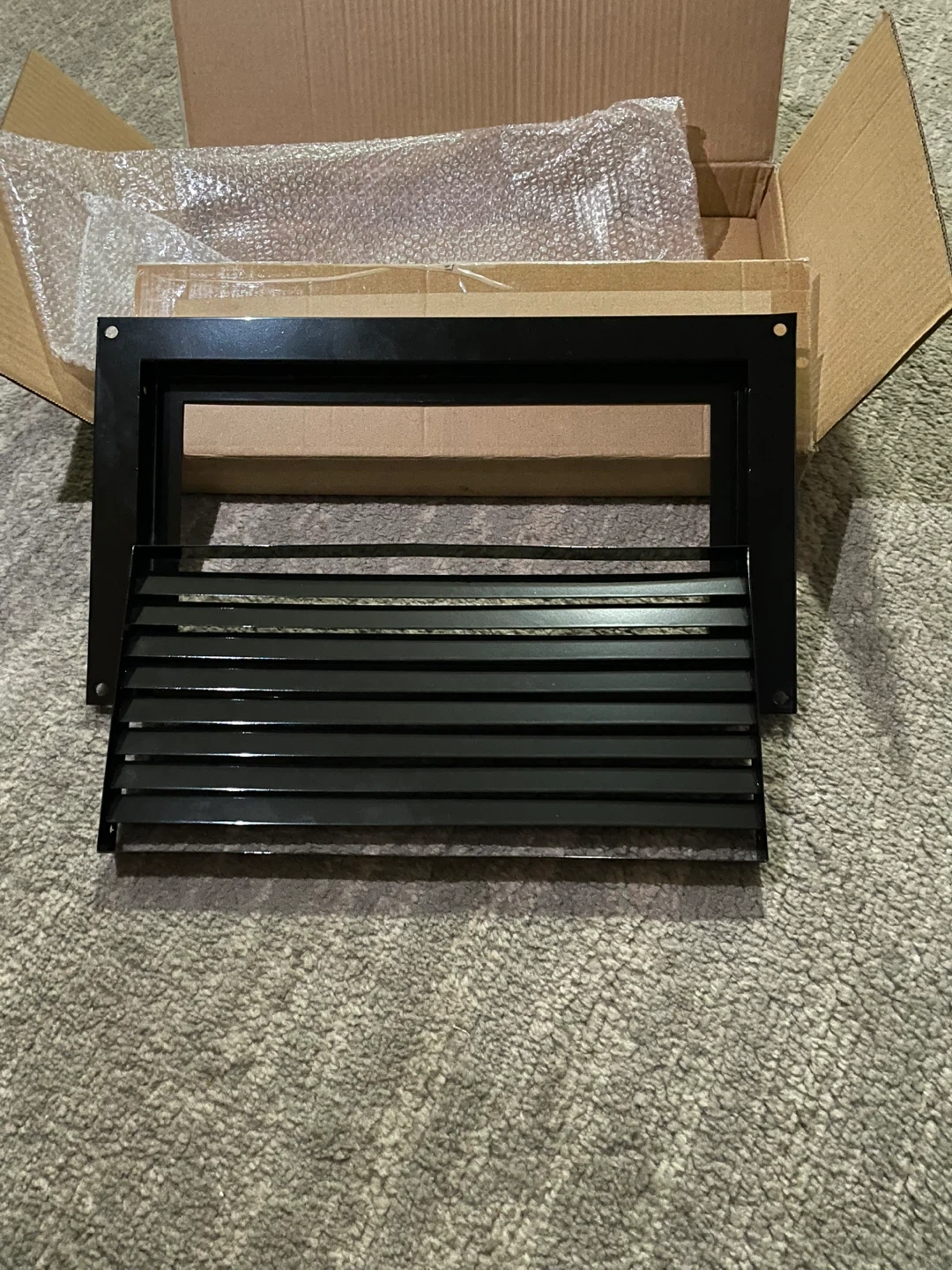 Selling a black metal over flow vent cover! It's in great condition and comes with all the necessary components and screws. The box is included as well, making it easy to transport