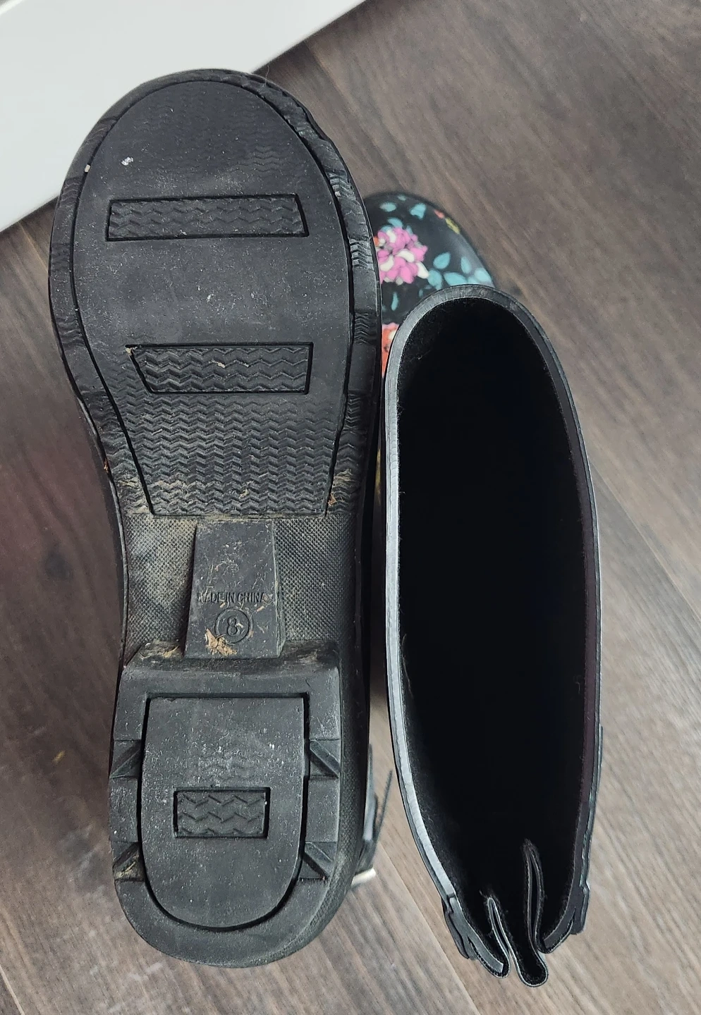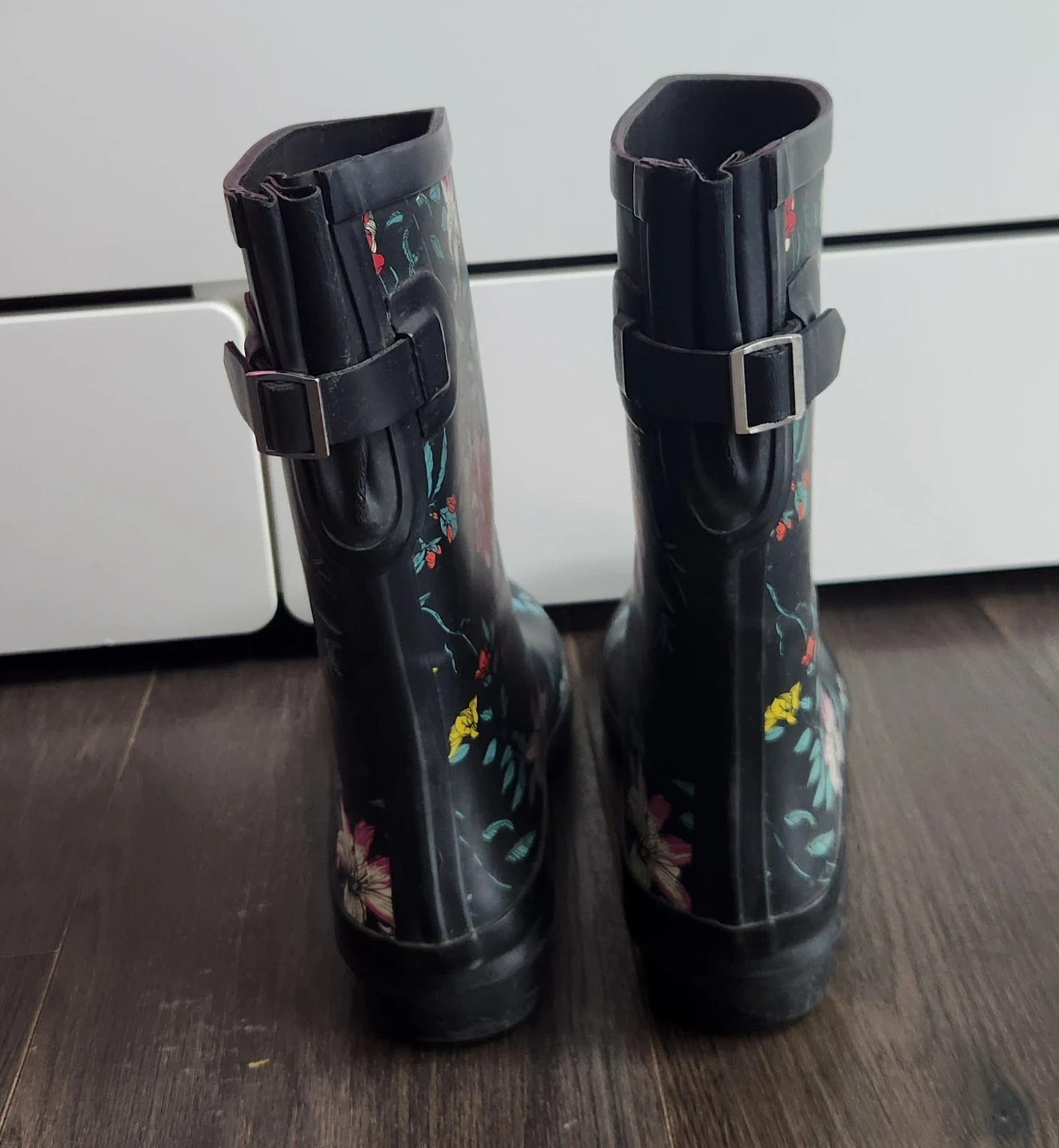 Cute rain boots with a floral pattern! These are a size 8 and in good condition, ready for some rainy day adventures