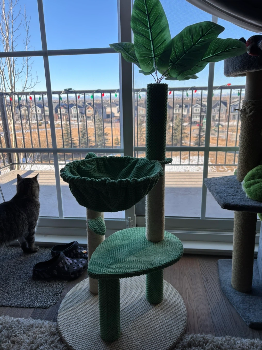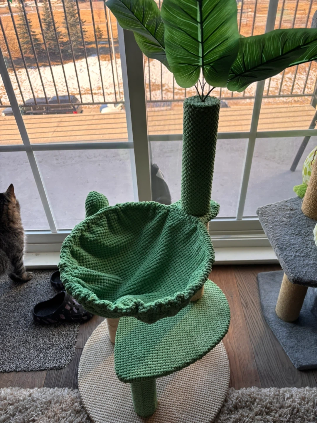 This adorable cat tree is perfect for your furry friend! It features a unique leaf design that will add a touch of nature to your home. Your cat will love lounging in the cozy basket and scratching on the sturdy posts. It's in great condition and ready for a new home!