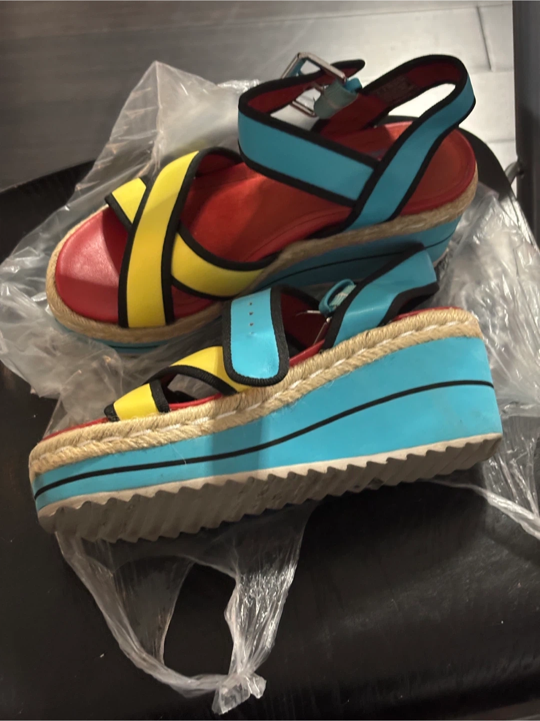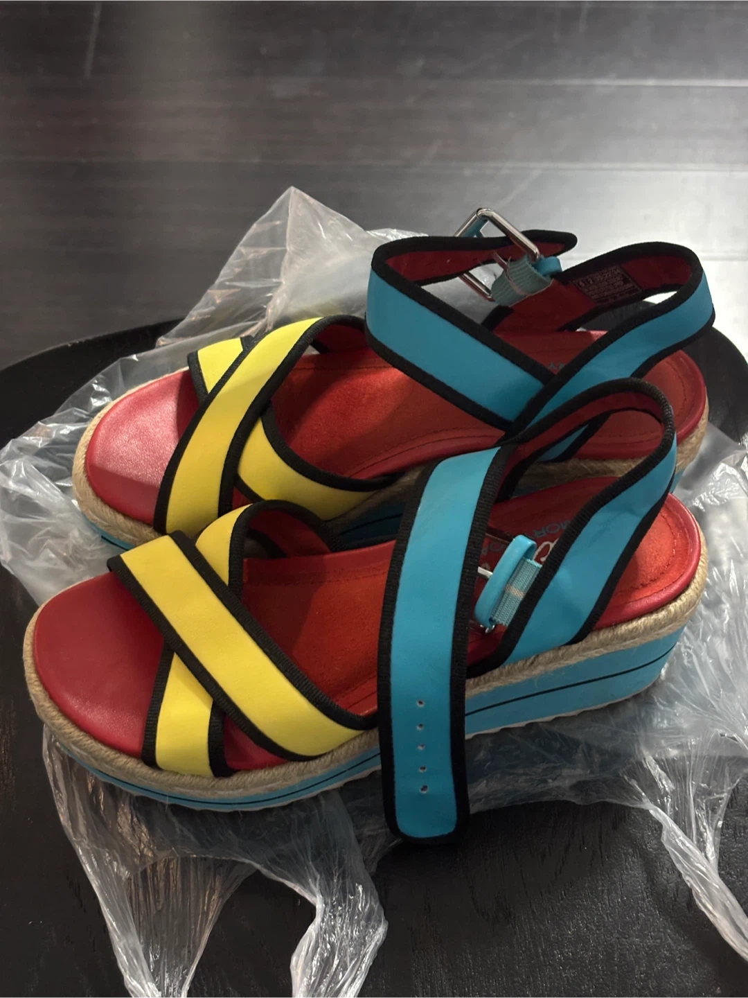 These Skechers Cali sandals are a fun pop of colour! They feature a platform sole and come in a size 5. The vibrant colour blocking makes them a unique addition to any wardrobe