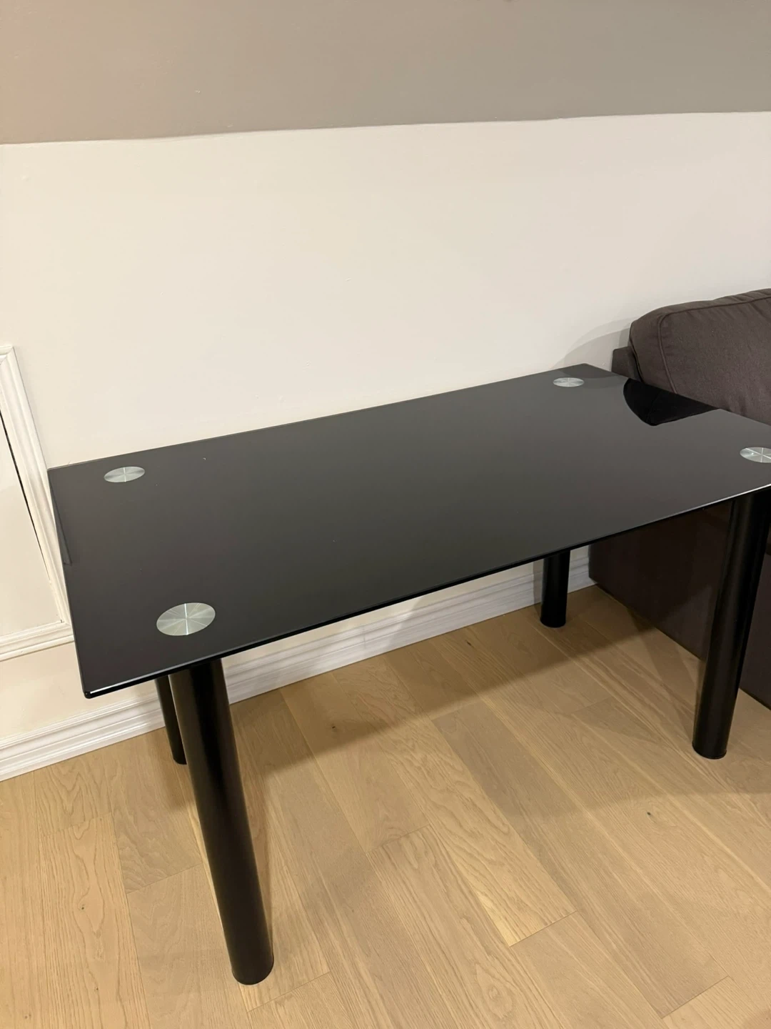 Selling a sleek black glass top dining table. It's in great condition and would be a stylish addition to any dining room or kitchen!
