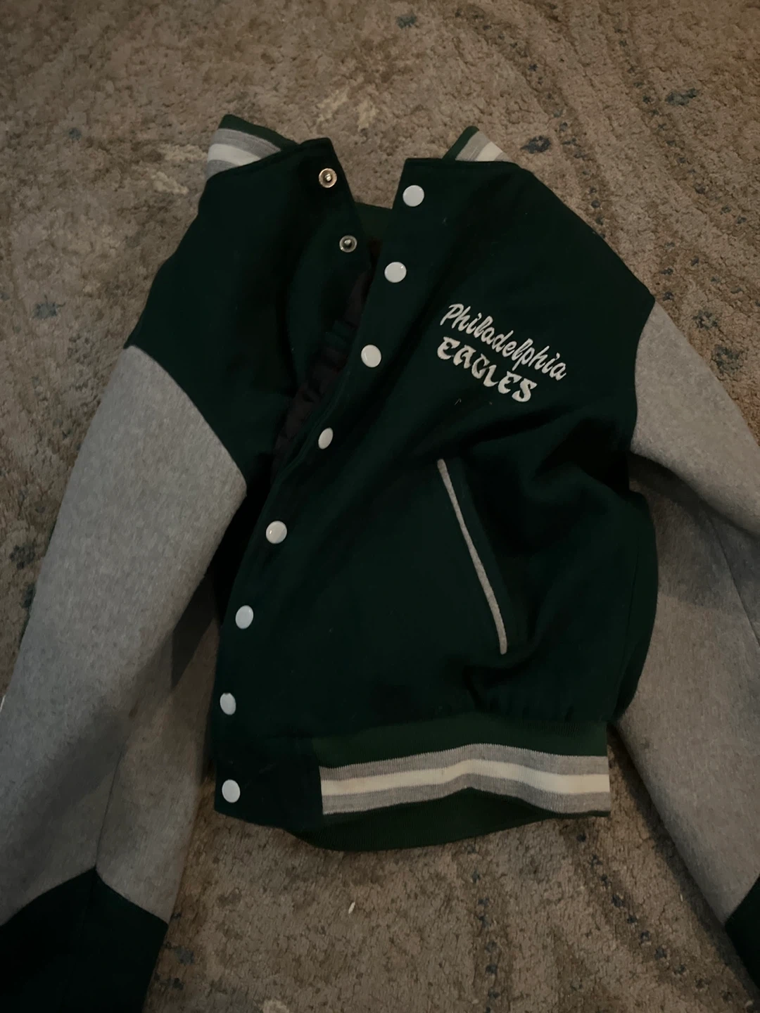 Selling a Philadelphia Eagles NFL vintage varsity jacket! It's got a classic look with the team's logo and colours. Perfect for showing your team spirit on game days or just adding a sporty touch to your outfit