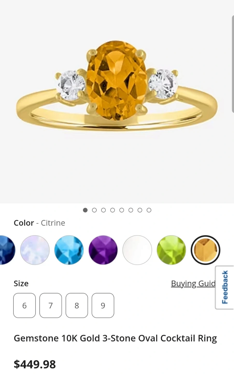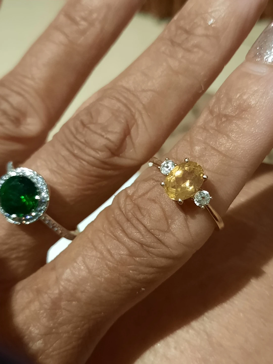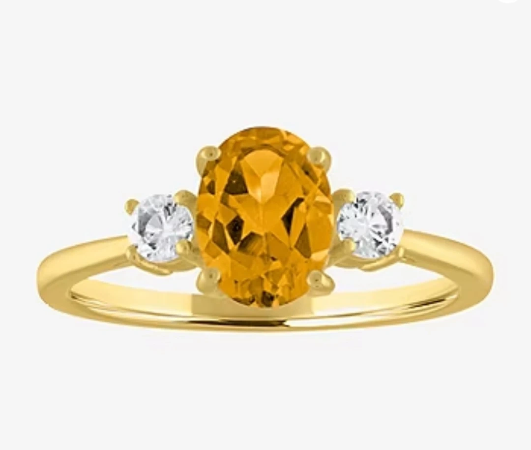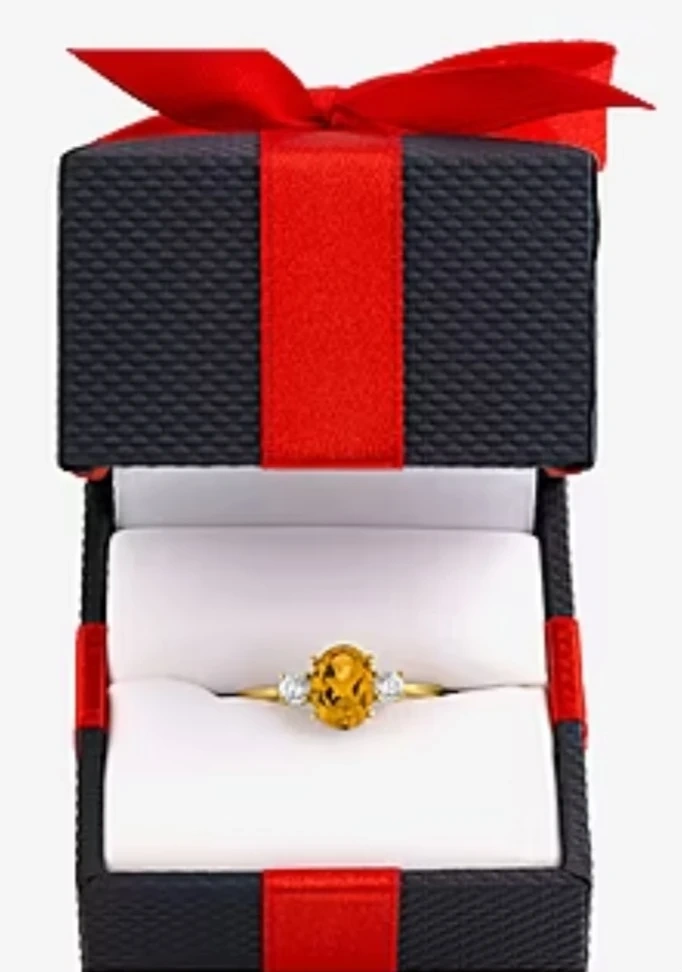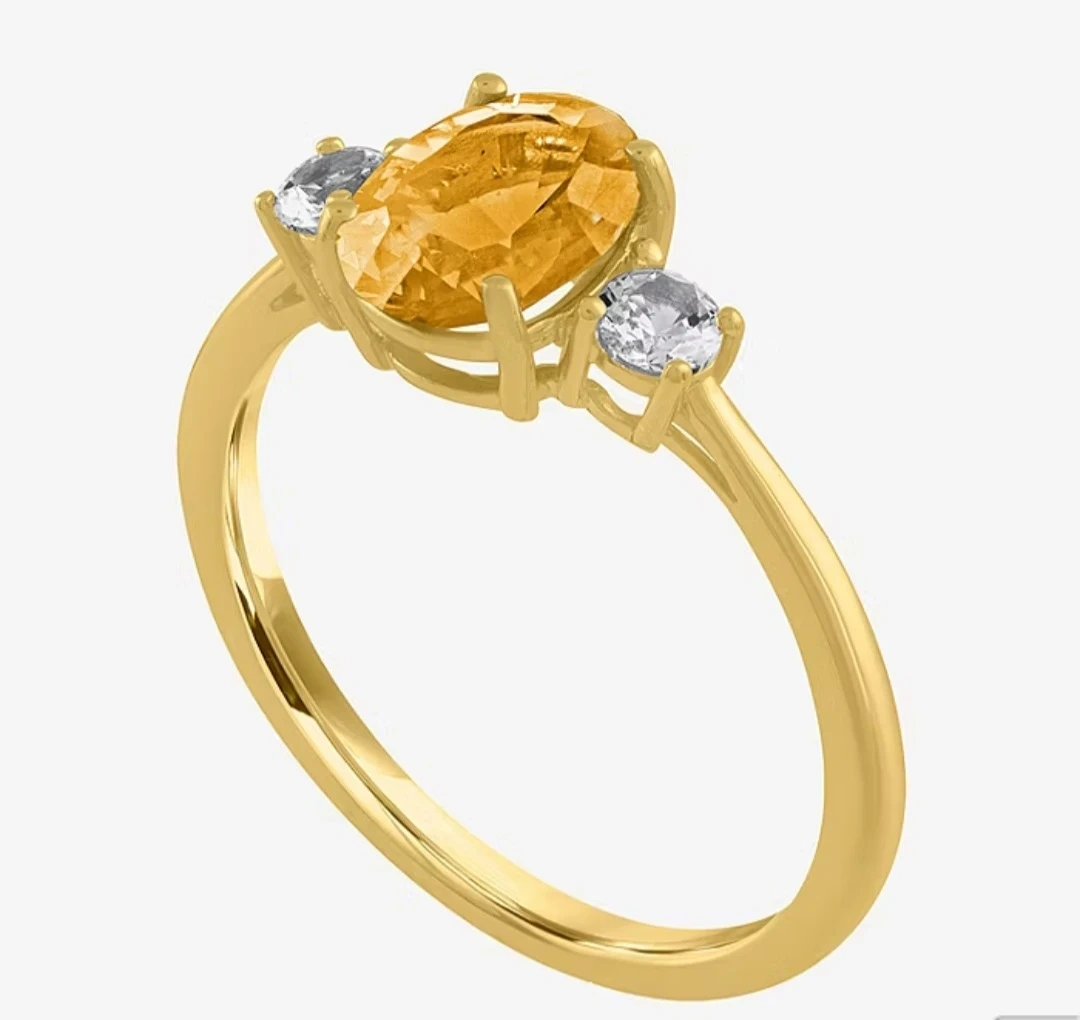 This is a beautiful gemstone ring featuring a genuine citrine stone and two lab-created sapphires. The metal is 10K gold with a yellow colour. The stone cut is oval, and the setting is prong. It is a size 7. Originally bought for $449.98. Comes with the box