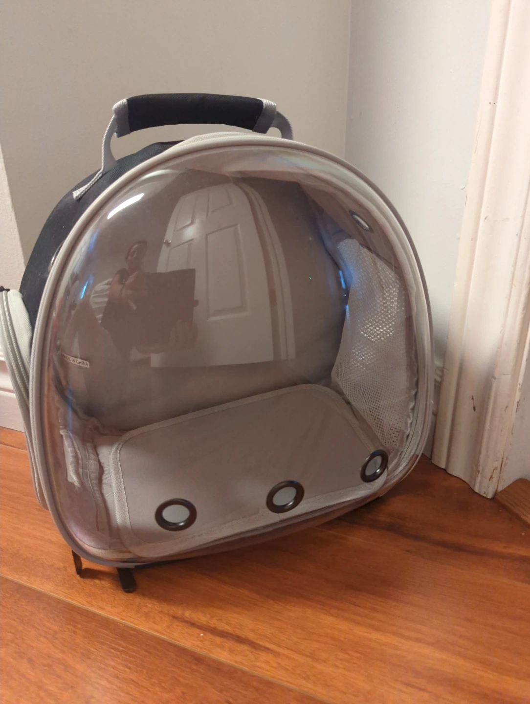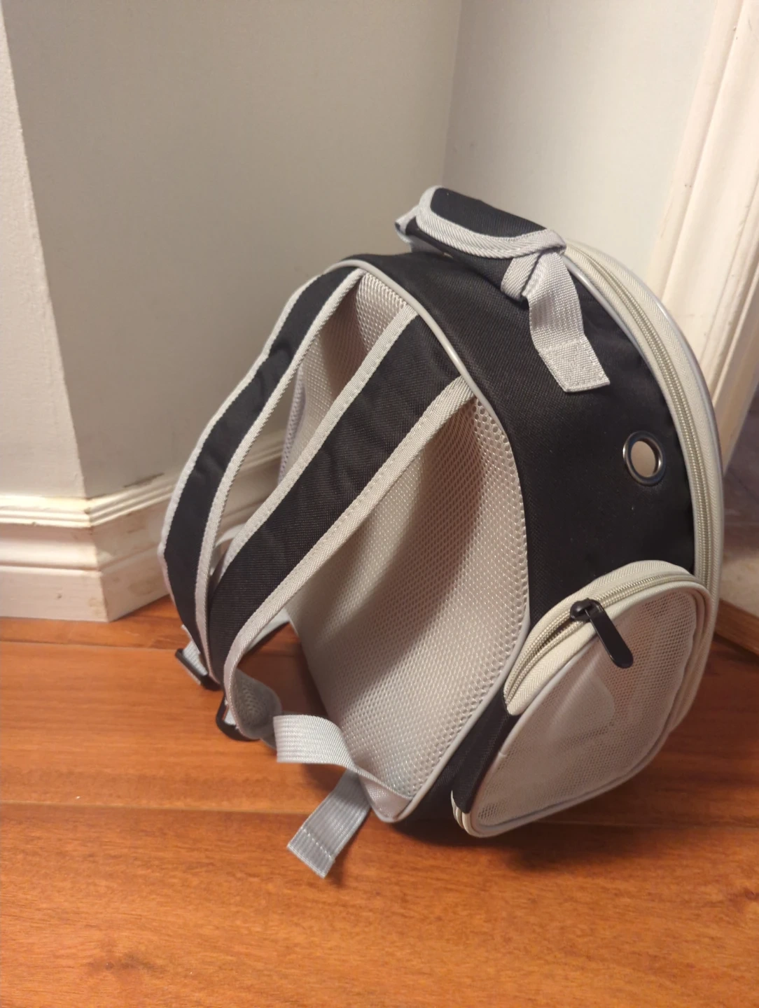 Looking to sell this pet carrier backpack. It has a space capsule design with a clear dome, so your pet can enjoy the view while travelling. It's in great condition and perfect for small cats, dogs or reptiles. The backpack has adjustable straps and ventilation holes for comfort and safety