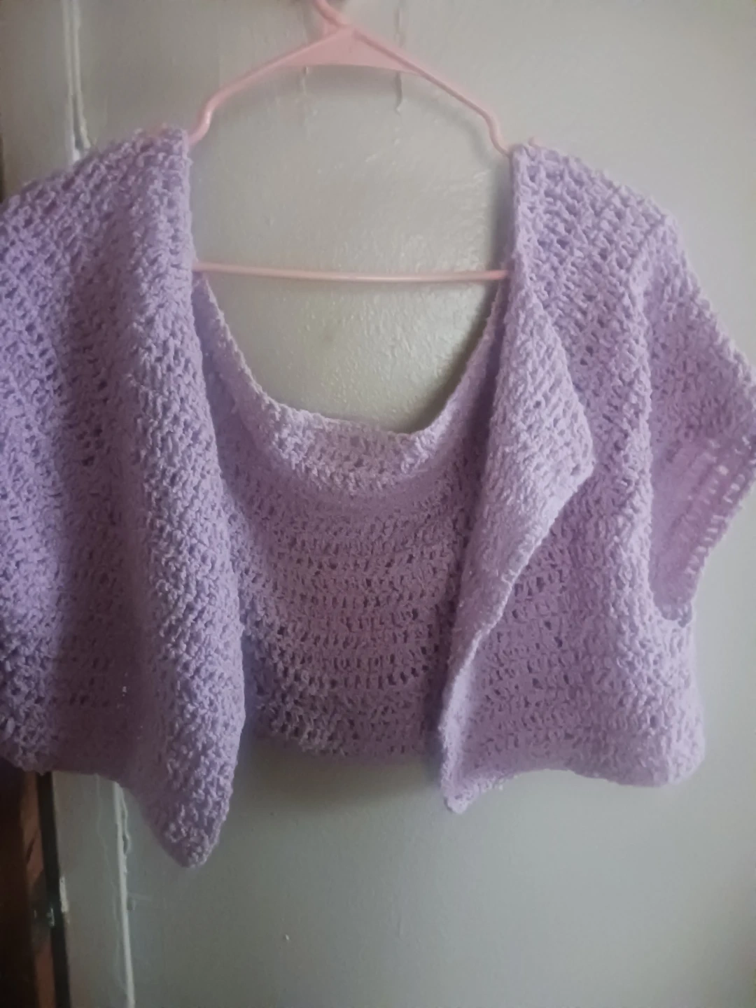 a cute, handmade crocheted shrug in a lovely lilac color! It's perfect for layering and adding a touch of handmade charm to any outfit. The material is soft and comfortable, great for spring or summer evenings. It's in great condition and ready for a new home!