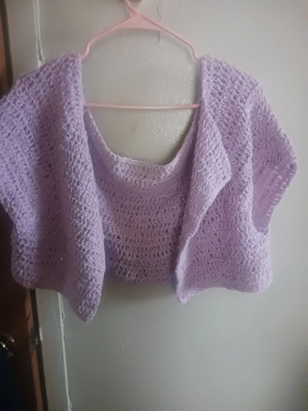 a cute, handmade crocheted shrug in a lovely lilac color! It's perfect for layering and adding a touch of handmade charm to any outfit. The material is soft and comfortable, great for spring or summer evenings. It's in great condition and ready for a new home!