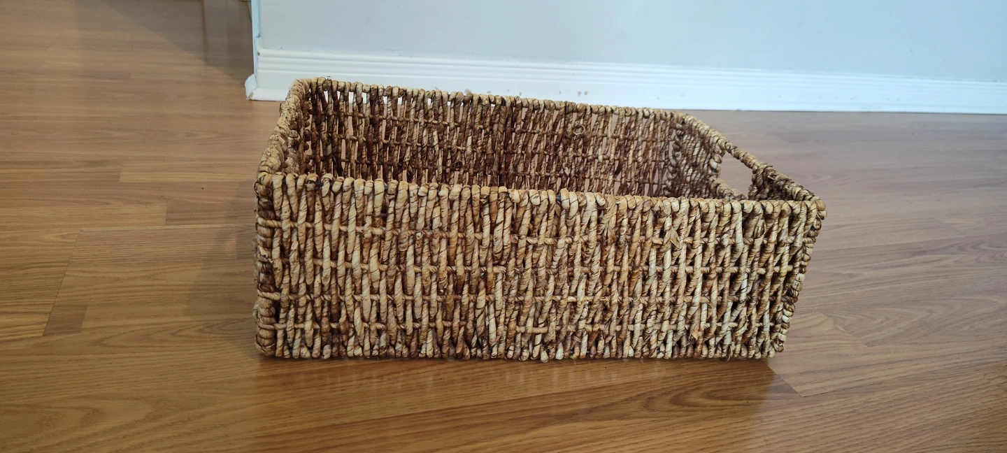 Here's a lovely woven storage basket, perfect for organizing your space! It's in great shape and ready to hold your items.