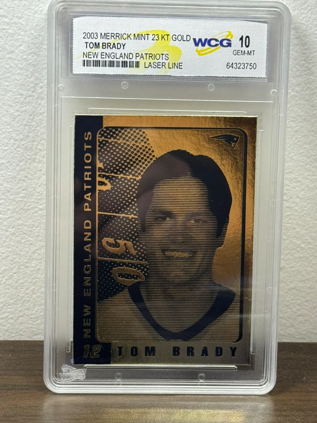 Selling a 2003 Merrick Mint 23 KT Gold Card featuring Tom Brady of the New England Patriots. It's graded WCG 10 and in gem-mint condition. A great addition to any sports memorabilia collection!