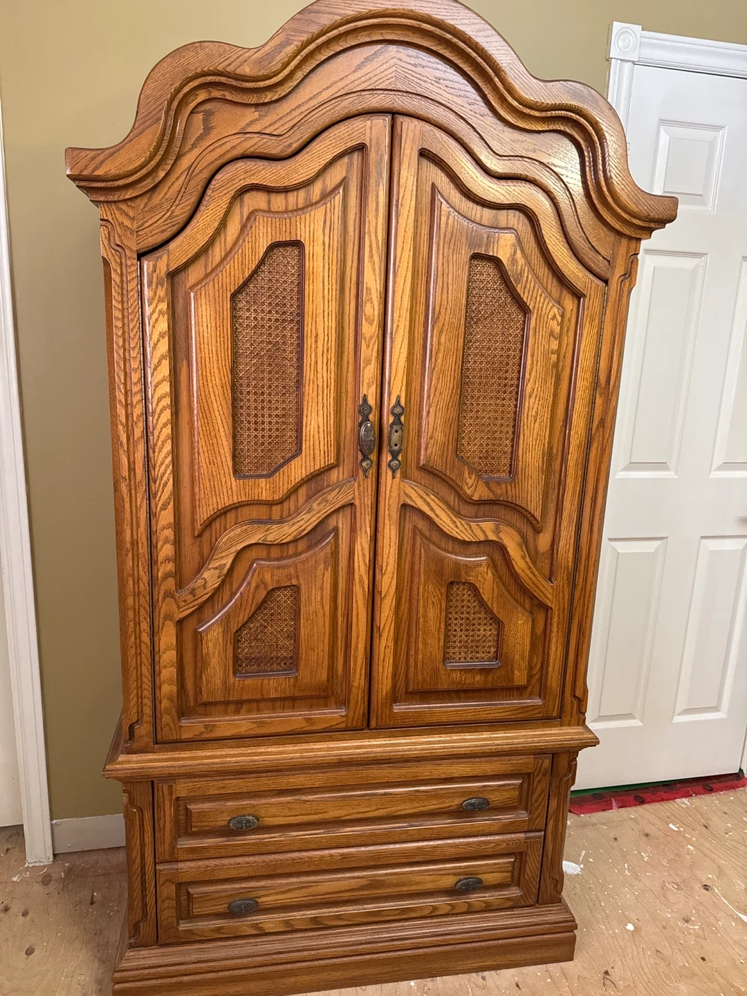 Selling a beautiful oak bedroom set! Includes a large armoire, a bed frame, a nightstand, and a dresser with a triple mirror. All pieces feature a lovely oak finish and intricate detailing. Perfect for adding a touch of classic elegance to your bedroom