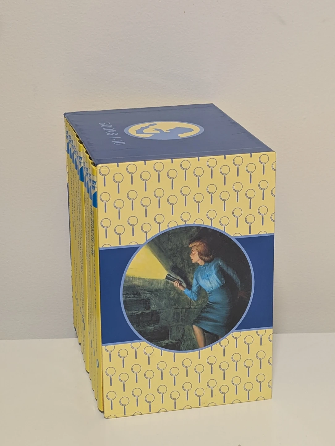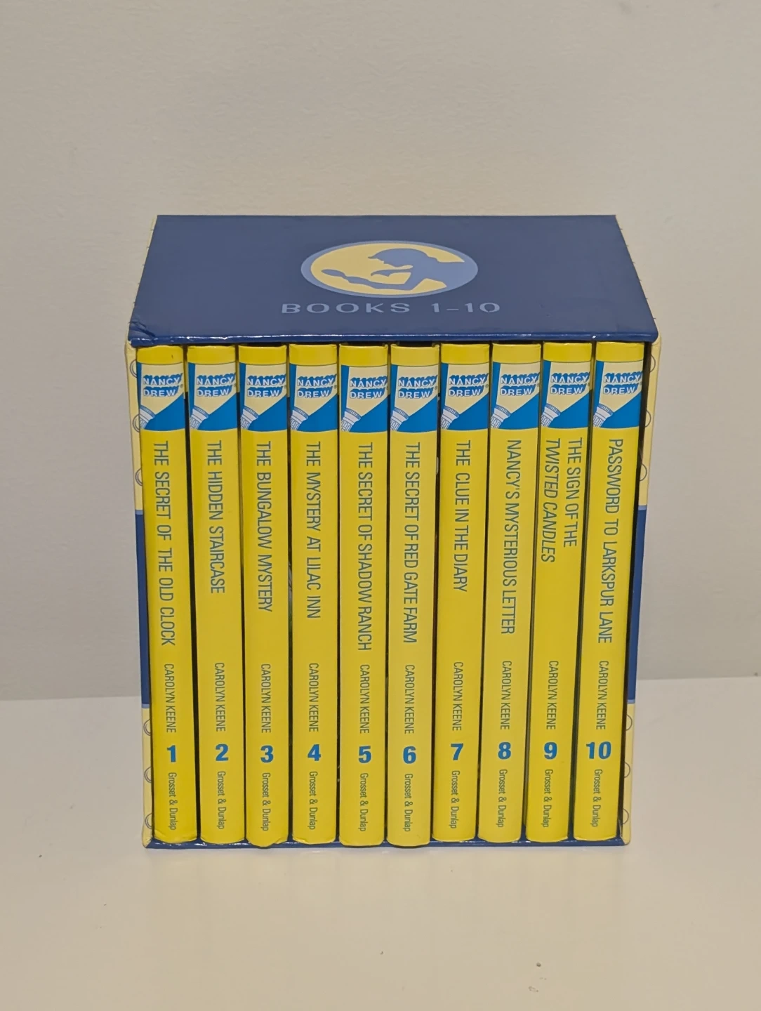 Selling the Nancy Drew Mystery Stories Collection, books 1 through 10! This set comes in a box, perfect for any Nancy Drew fan or collector. Each book is by Carolyn Keene.