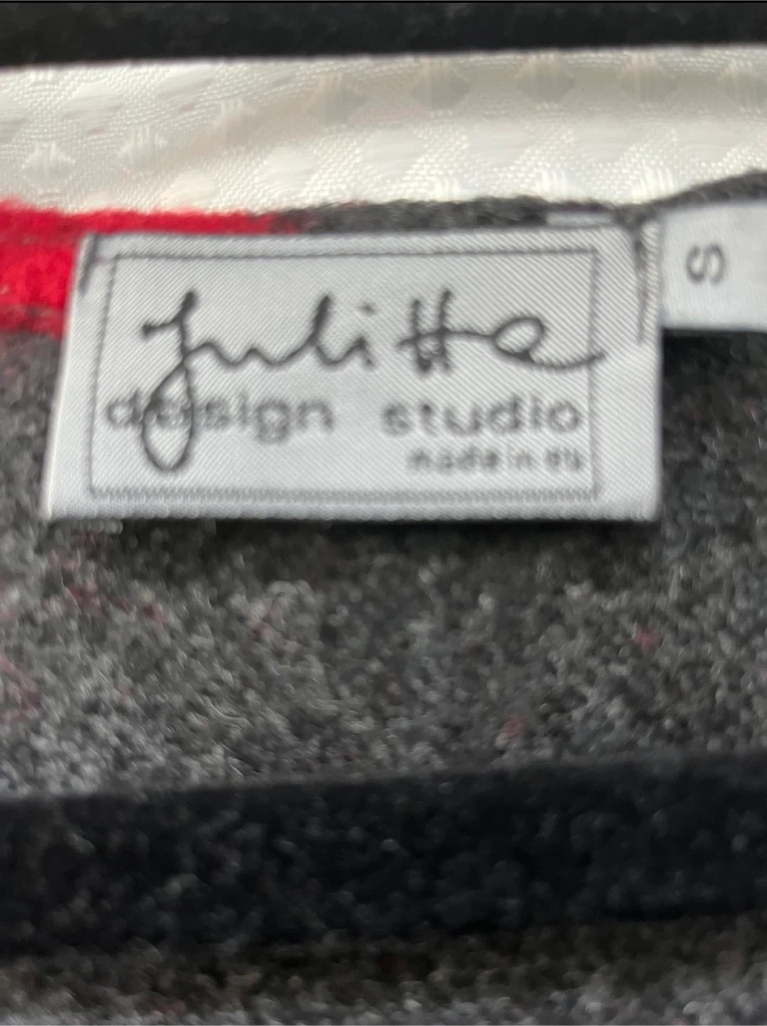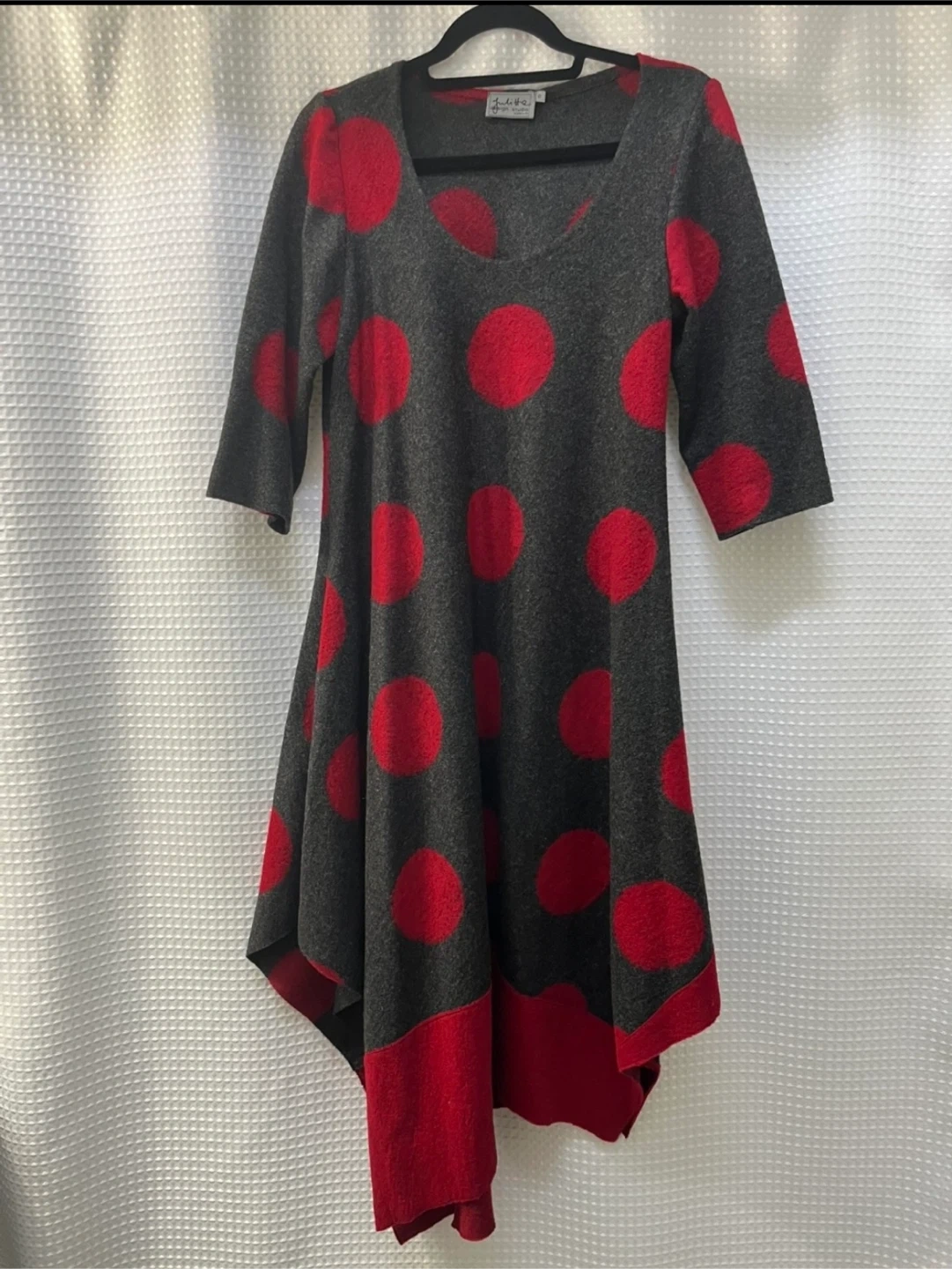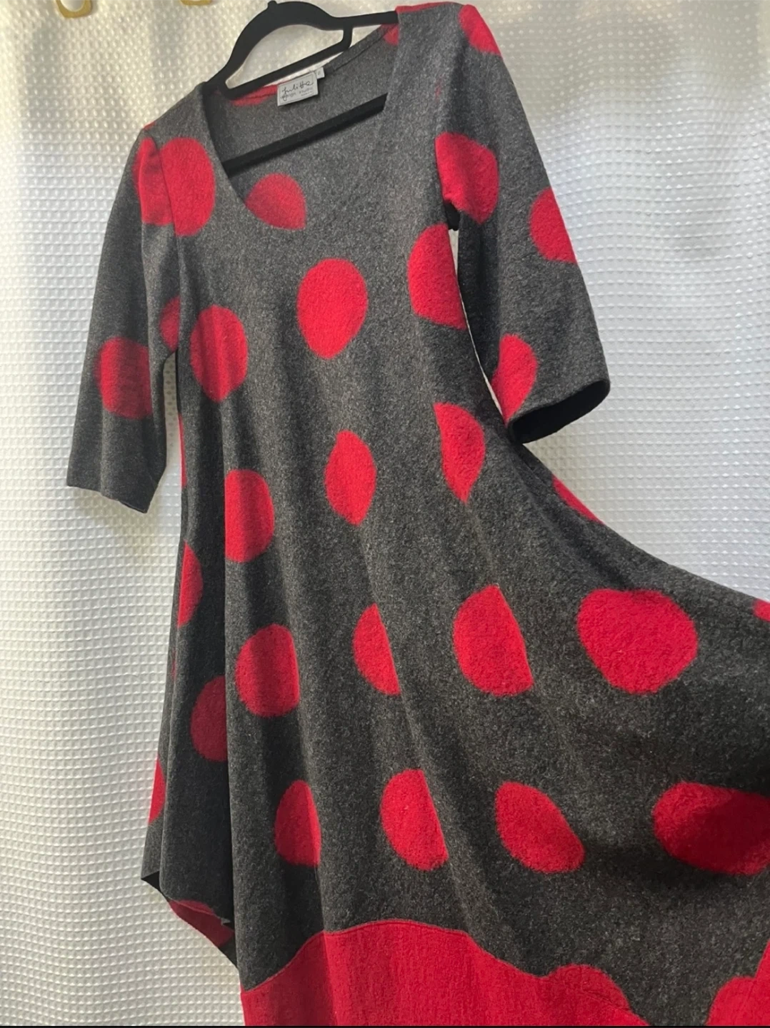 This is a Julitta Design Studio dress, made of 100% laine (wool). It features a unique polka dot pattern in red and gray. It's a size small but can fit M in great condition! Never worn, brand new!