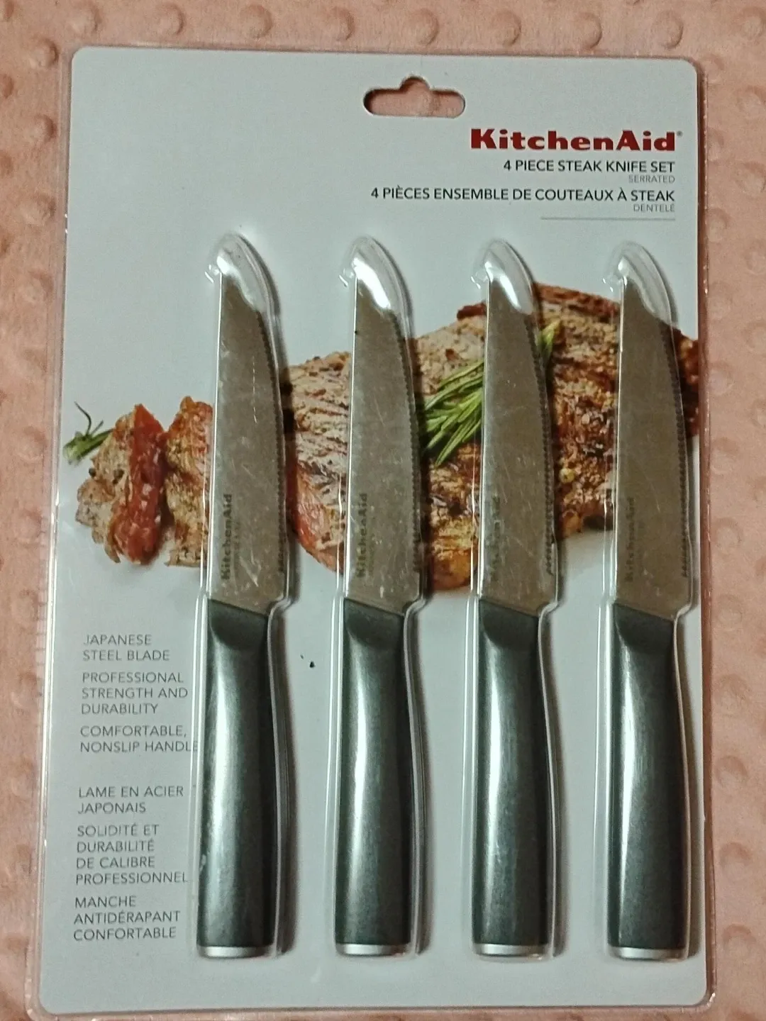 Selling a brand new KitchenAid 4-piece steak knife set! These knives feature Japanese steel blades for professional strength and durability. They also have comfortable, nonslip handles. Perfect for your next steak night!