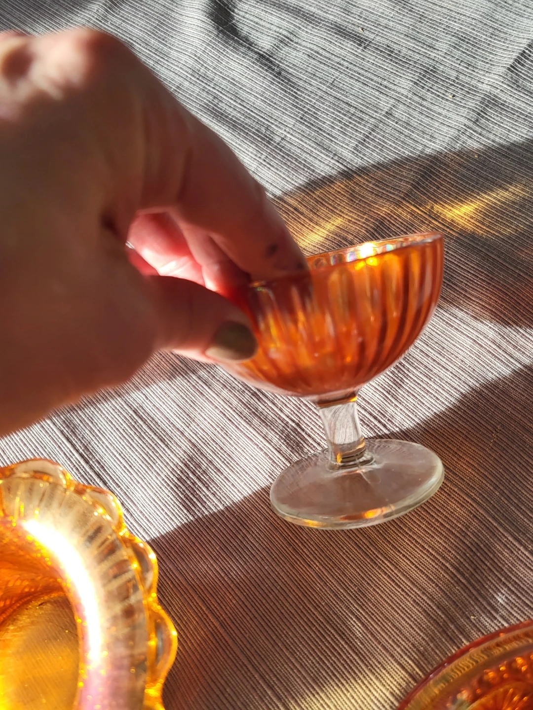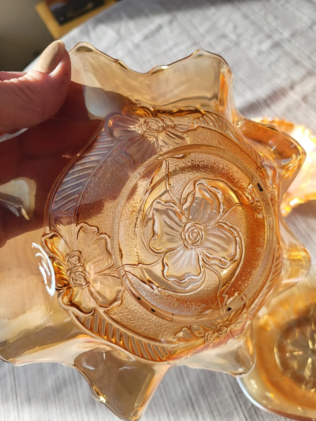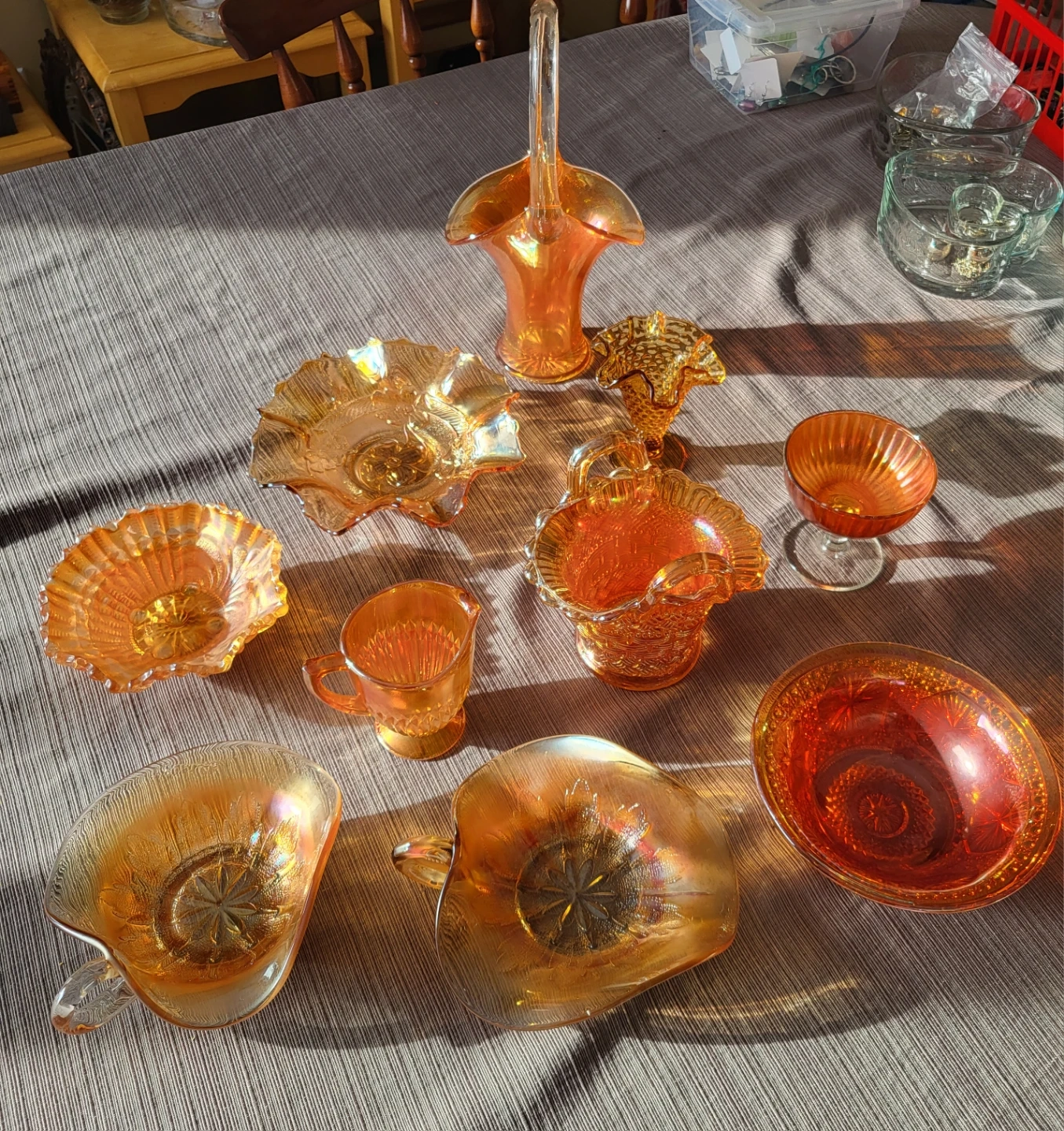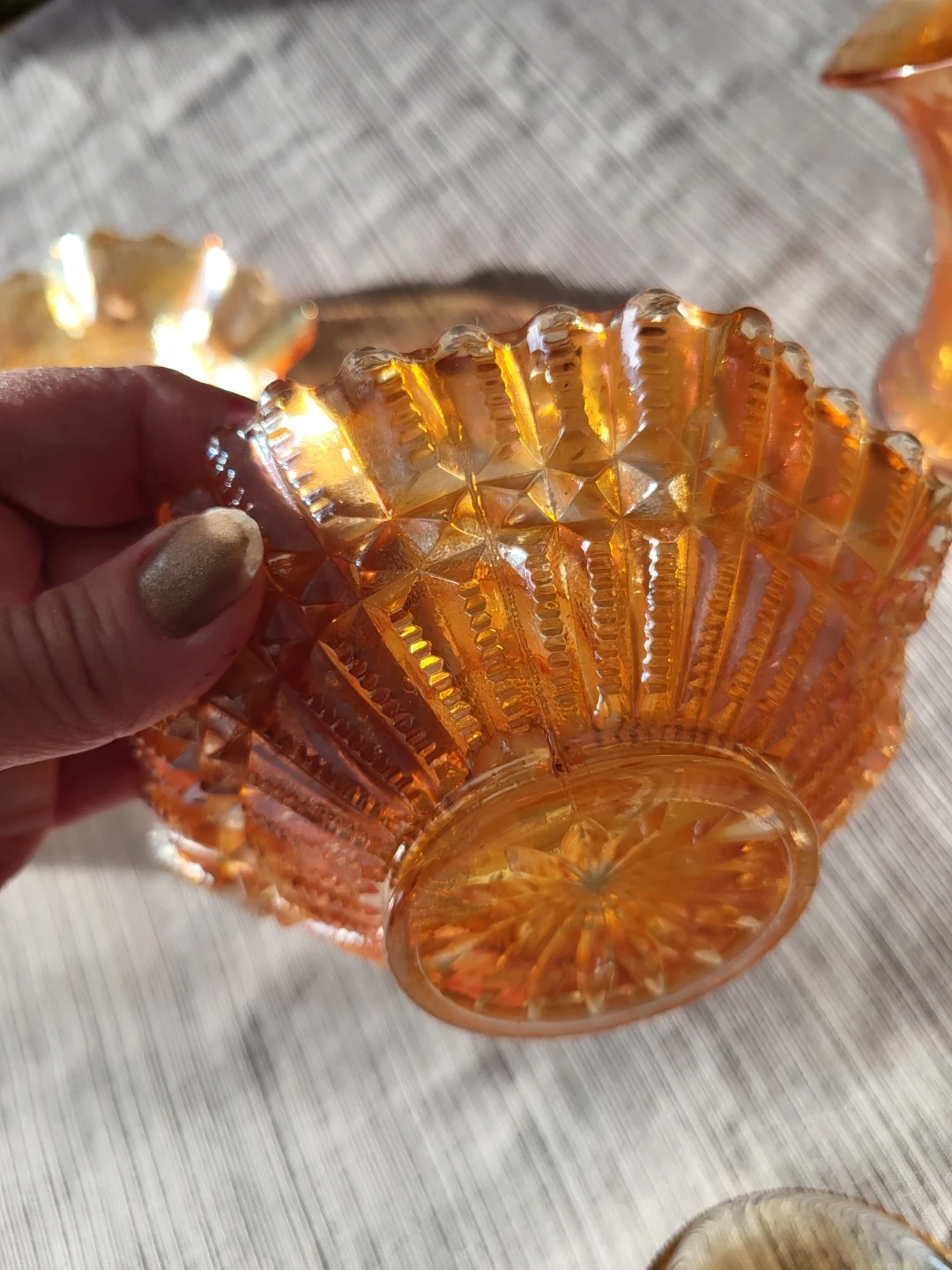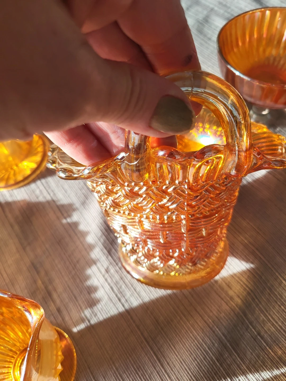 Selling a beautiful collection of vintage carnival glass pieces! This set includes various bowls, a basket, and a small pitcher, all in a lovely iridescent orange colour. These pieces would be a great addition to any collection or as unique home decor