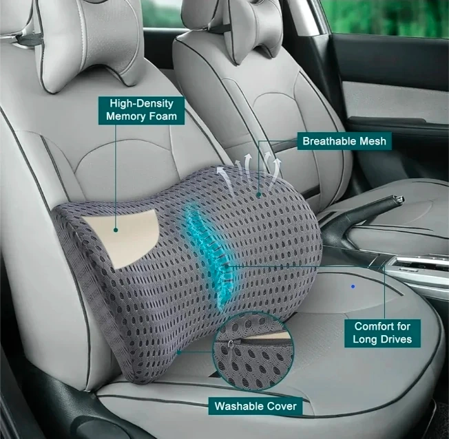 This lumbar support pillow is designed with a raised module in the "T point" area of the cross between the waist and lumbar vertebrae. It offers "C type" waist protection and "T" point waist support. It's made with high-density memory foam and breathable mesh, with a washable cover for easy cleaning. It's great for comfort on long drives and helps relieve pain and fatigue by supporting the waist area and sides