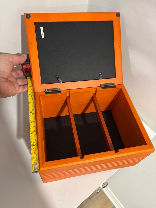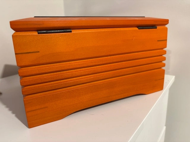 This orange wooden box is in good condition and measures approximately 10 inches by 7 inches by 5 inches. The lid features a frame where you can insert a picture for personalization. This box is ideal for storing jewelry, keepsakes, or as a decorative piece in your home.
