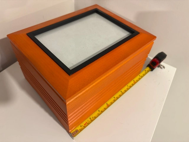 This orange wooden box is in good condition and measures approximately 10 inches by 7 inches by 5 inches. The lid features a frame where you can insert a picture for personalization. This box is ideal for storing jewelry, keepsakes, or as a decorative piece in your home.