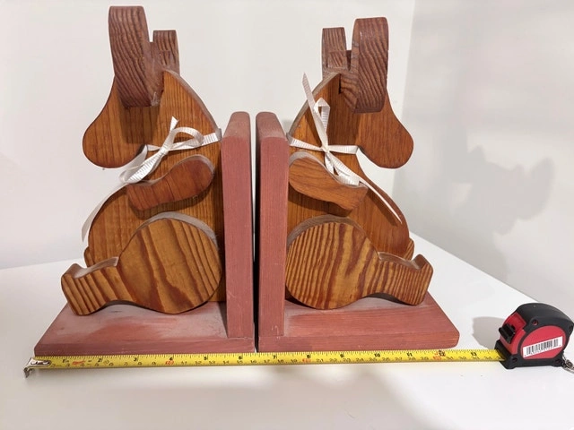 These are cute wooden moose bookends that are perfect for any rustic decor or child's room. These bookends are in good, used condition and feature a charming moose design. They are sturdy and functional, ready to hold your favourite books with a touch of woodland charm. These bookends have the following measurements: They are 18 cm wide and 18 cm tall.