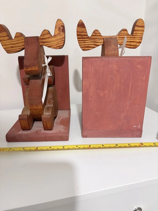 These are cute wooden moose bookends that are perfect for any rustic decor or child's room. These bookends are in good, used condition and feature a charming moose design. They are sturdy and functional, ready to hold your favourite books with a touch of woodland charm. These bookends have the following measurements: They are 18 cm wide and 18 cm tall.