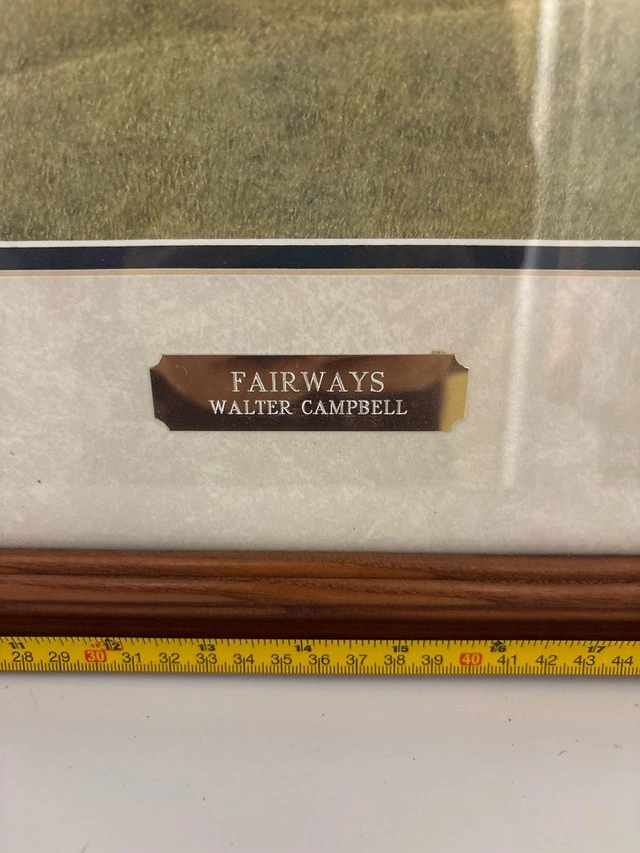 This framed Walter Campbell "Fairways" print captures a serene golf course scene and is in good used condition, making it a lovely addition to any room. This piece measures 45 inches in length and 32 inches in height, perfect for adding a touch of elegance to your space. * Artist: Walter Campbell * Title: Fairways * Dimensions: 45" x 32"